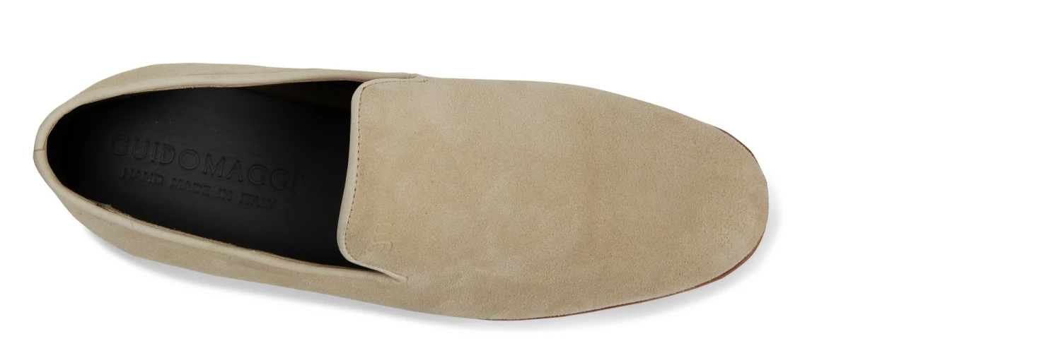 A great fit and an exclusive minimal design characterize this exquisite shoe. The GuidoMaggi elevator loafer has a soft beige suede upper and a 100% natural leather sole with clean lines and contemporary design. An ideal shoe for smart chic looks. The model ensures up to 2.56″ of extra height in total comfort and discretion. Handmade and custom made, 100% made in Italy.