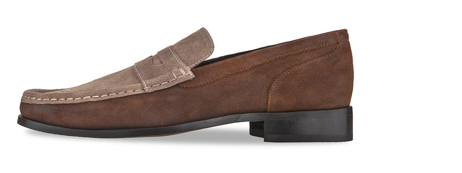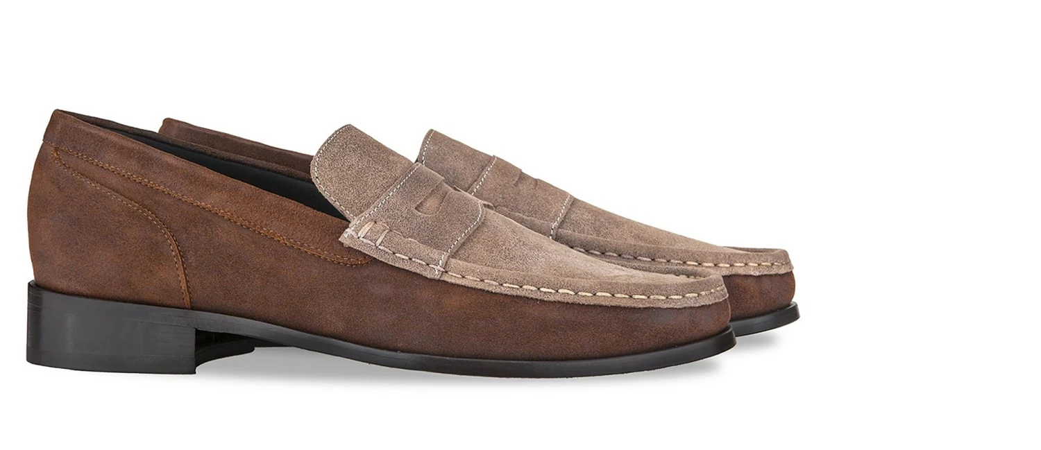 Elegant elevator loafers featuring upper made of brown and light brown waxed calfskin. The dark brown leather sole is Goodyear welted.