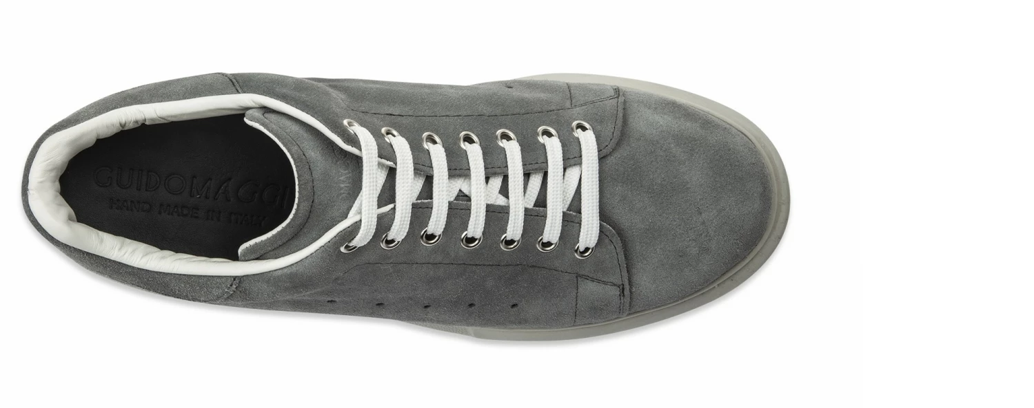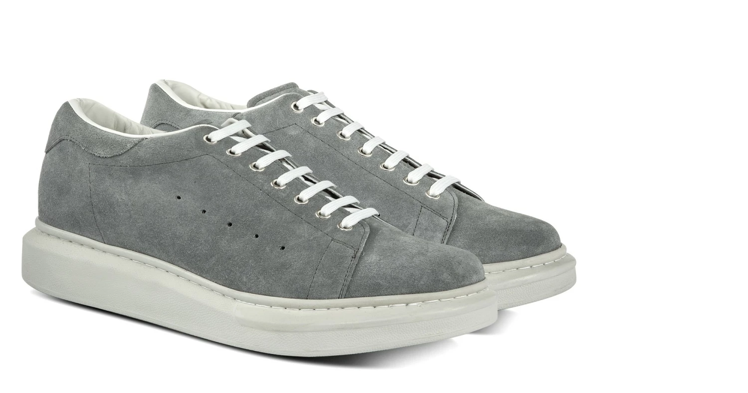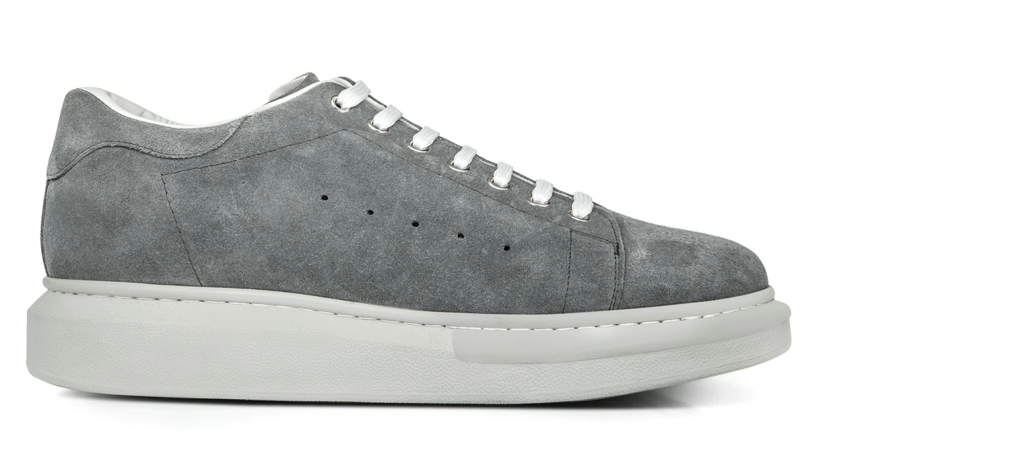 Stylish elevator sneakers featuring upper made of soft gray suede with tone-on-tone sole in super light natural rubber that improves the flexibility and stability of the walk.