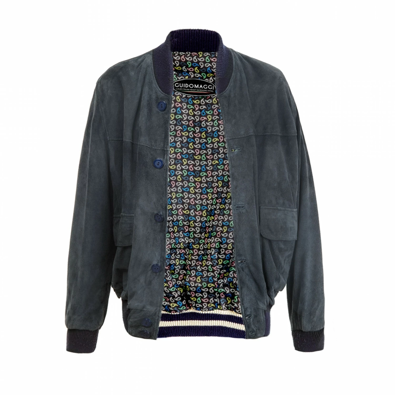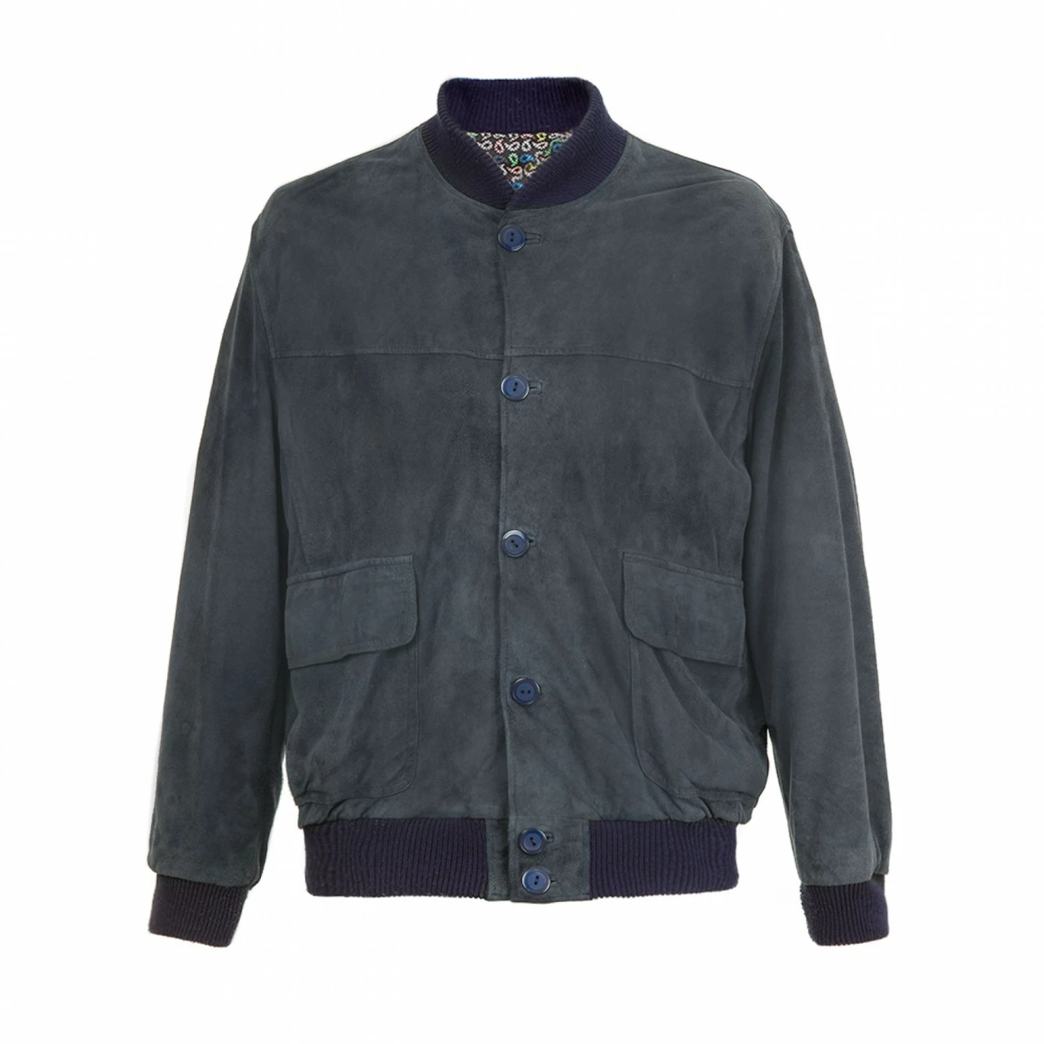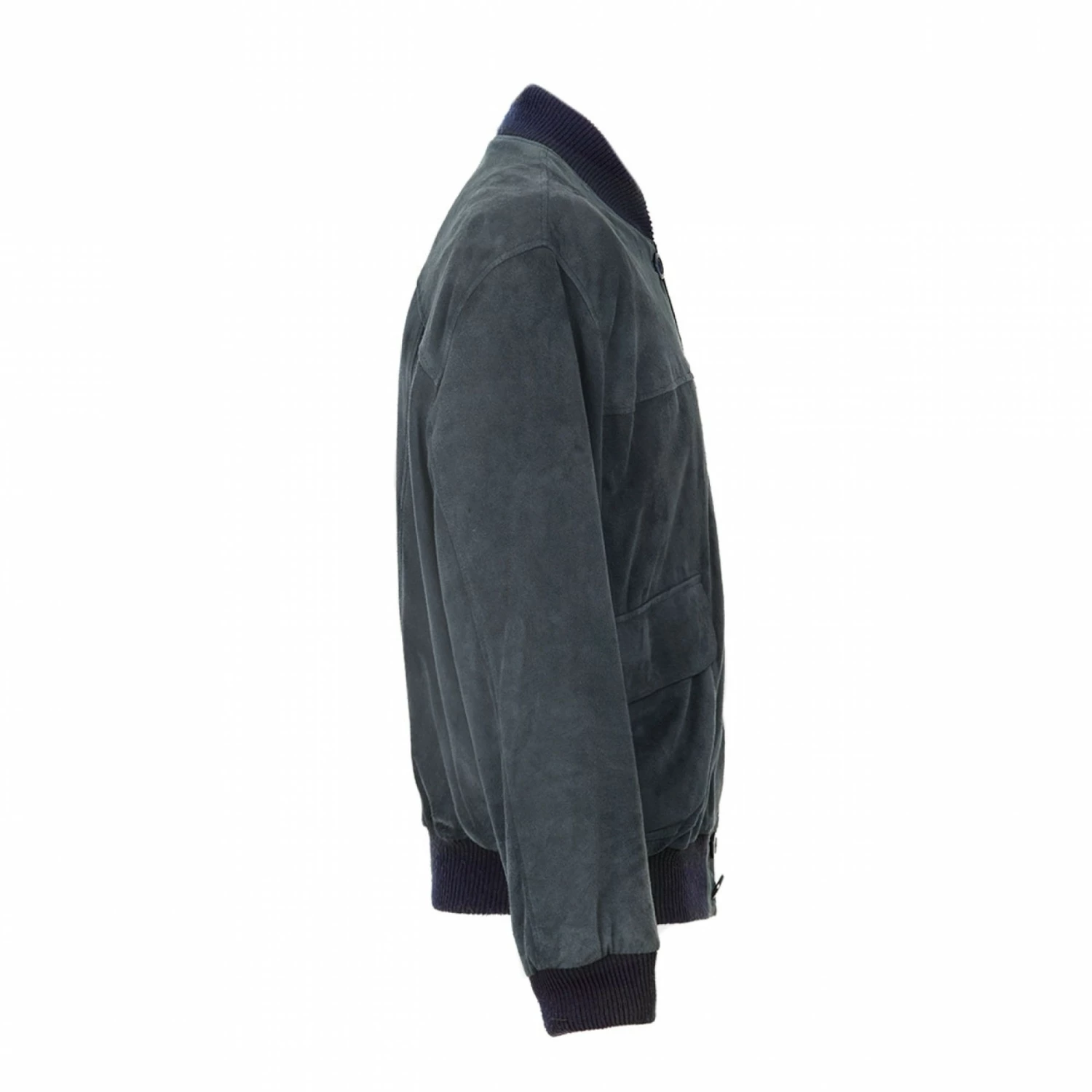 Handcrafted men’s leather jacket made of soft reindeer suede of a particular basalt gray colour and customizable inner lining in pure silk. Inspired by the 50s/60s style, Harvard has two front pockets and an inside pocket. Dark blue ribbed knit collar, bottom hems and cuffs. Buttons closure. Handmade in Italy.