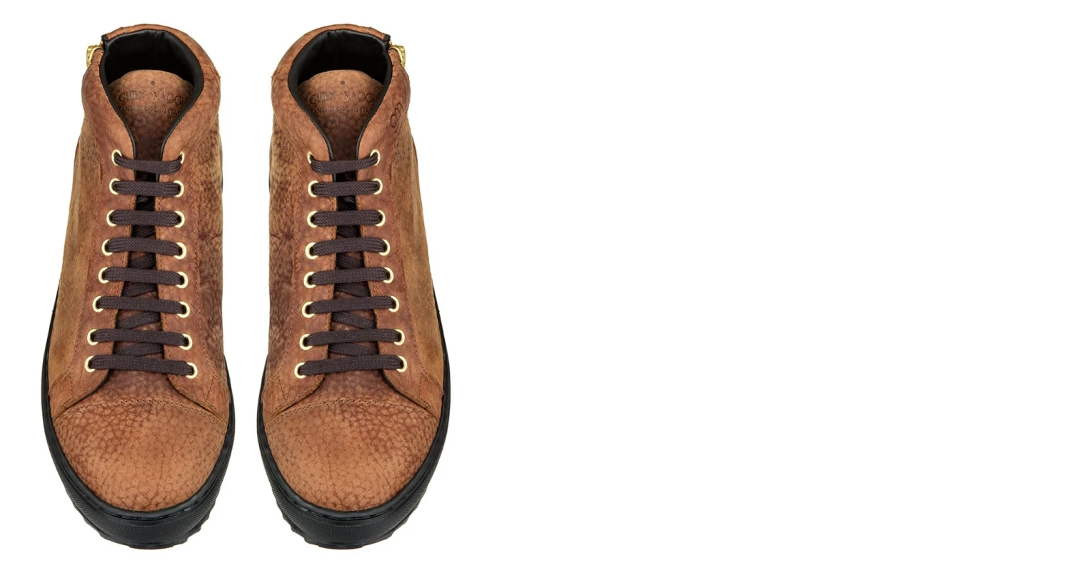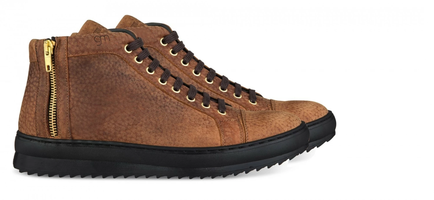 Luxury elevator sneakers made of soft Tuscan nappa leather featuring an elegant brown color and black extralight natural rubber sole. Laces in pure cotton and golden side zip.