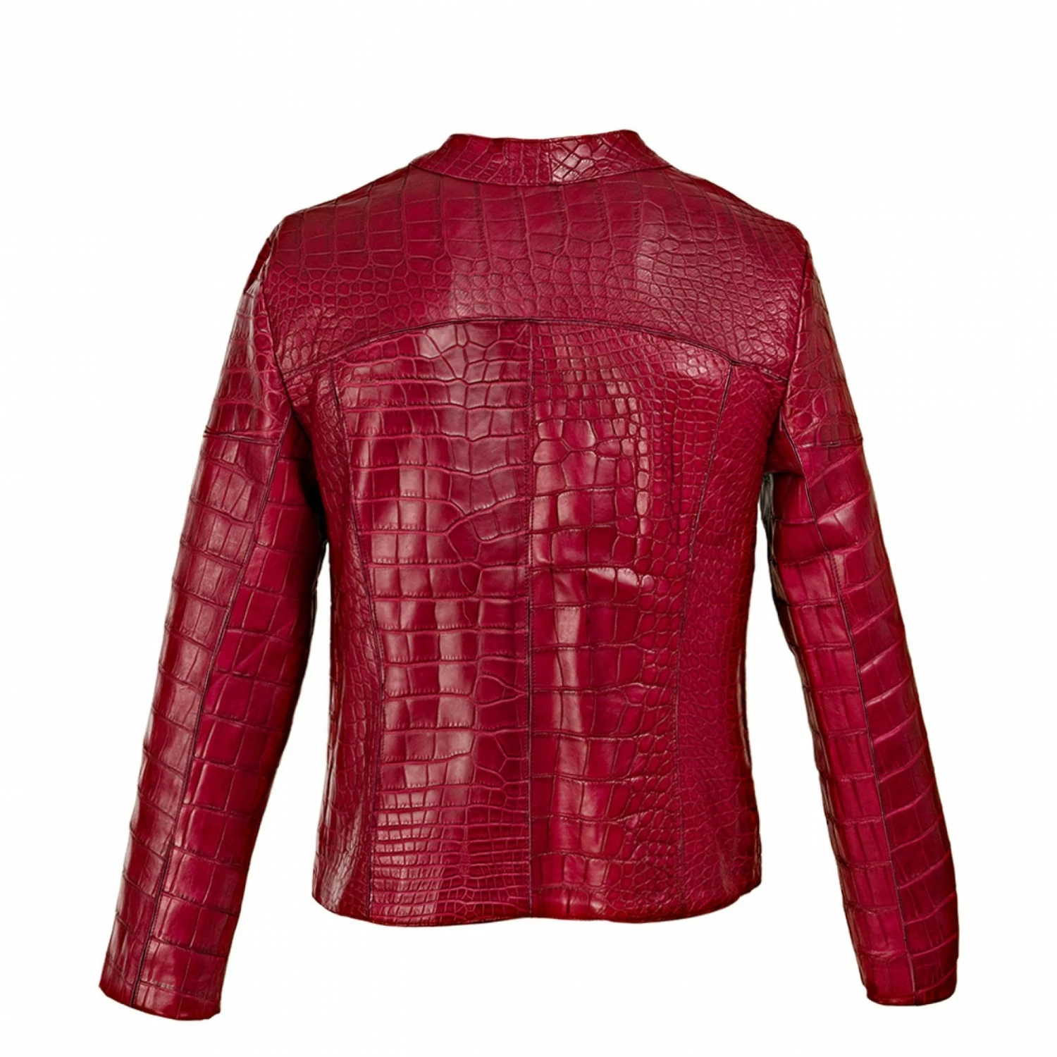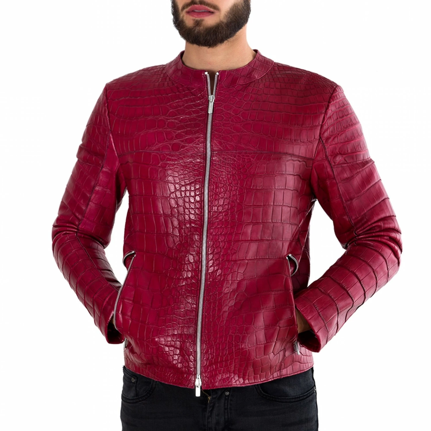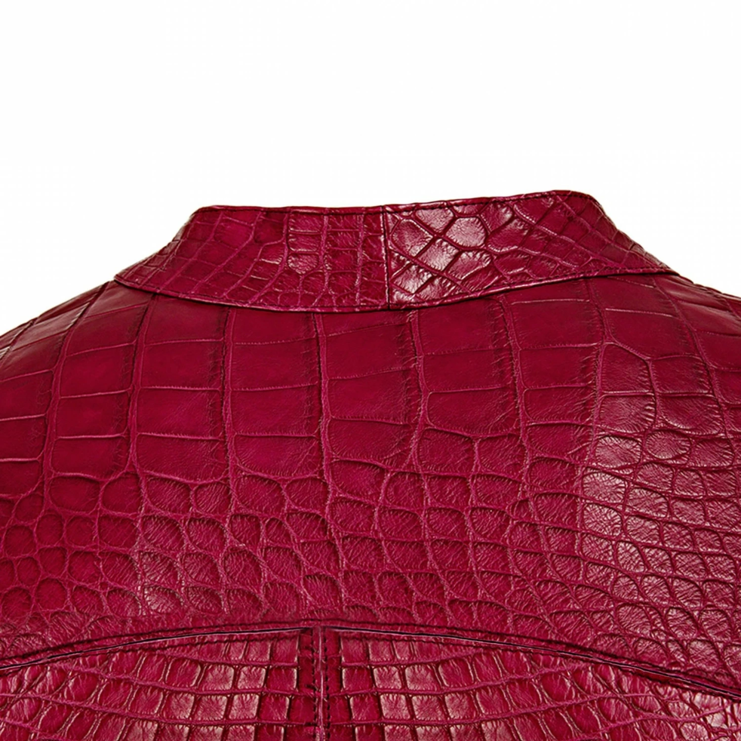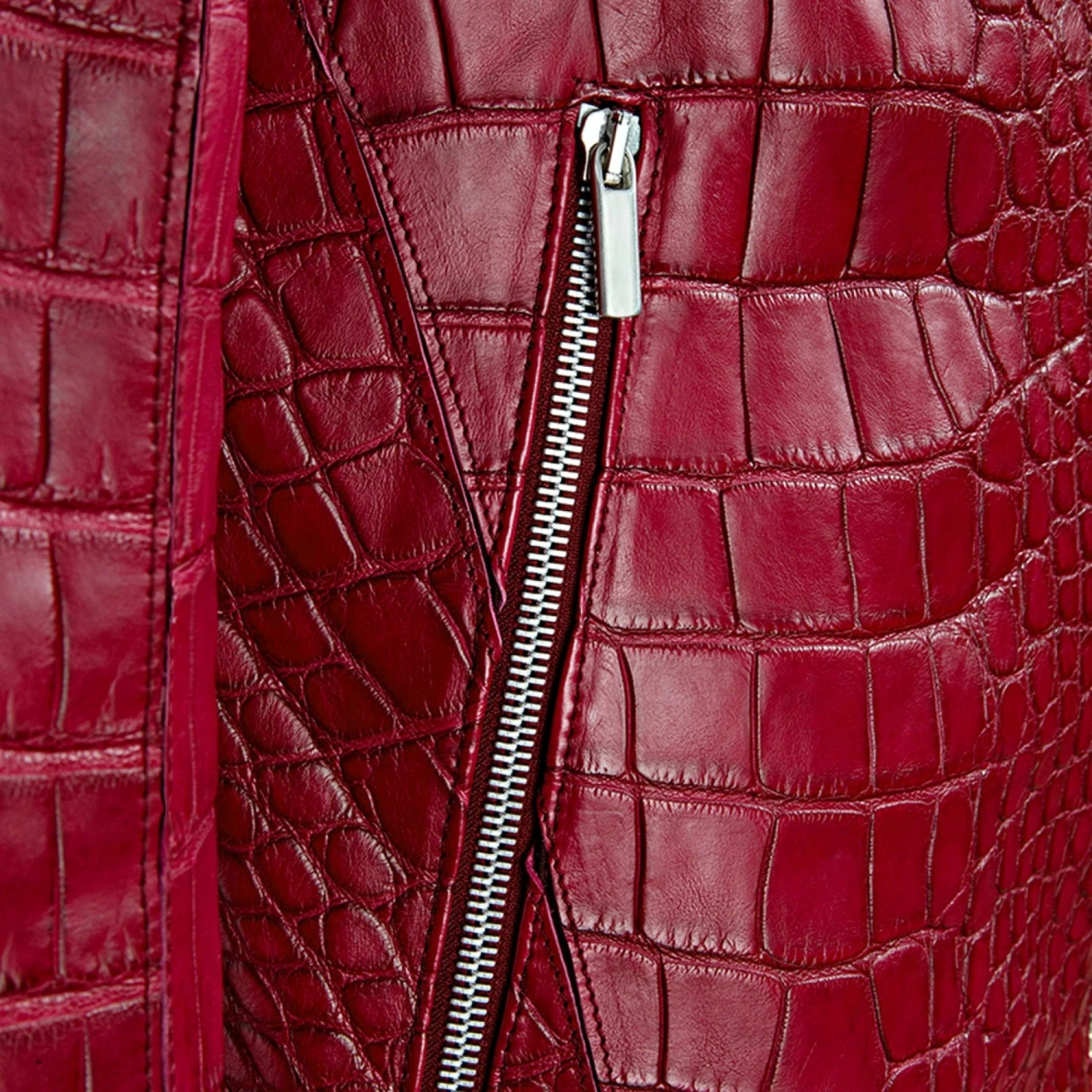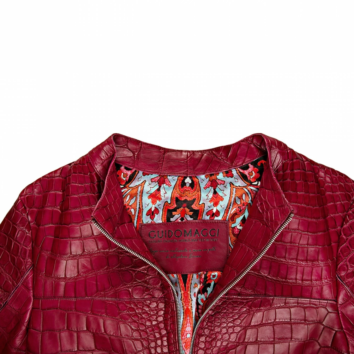 Contemporary biker jacket in fine Hermès alligator leather in a vivid red shade. The design, with a modern slim fit and a full zip, features a mandarin collar and a customizable inner lining.