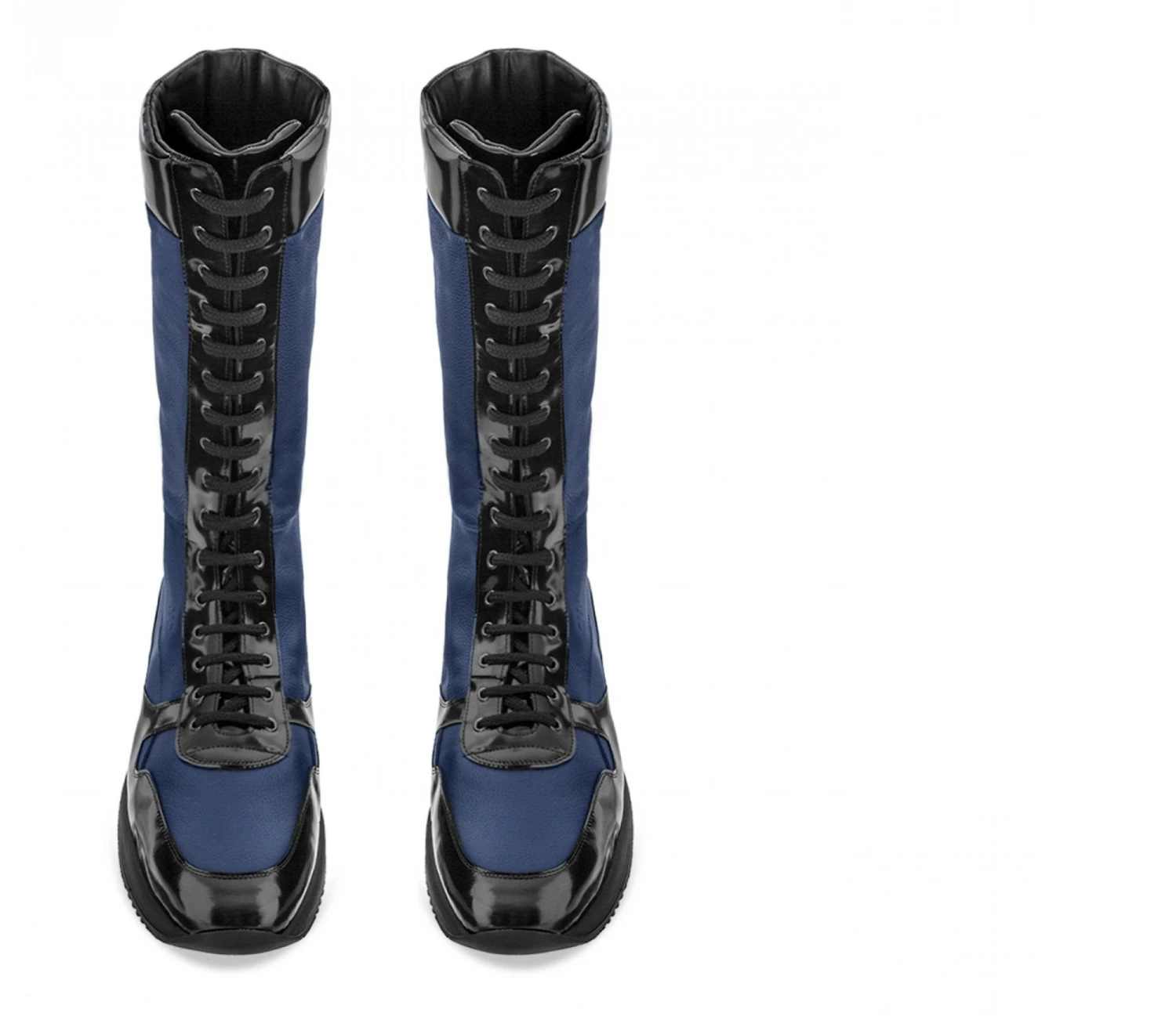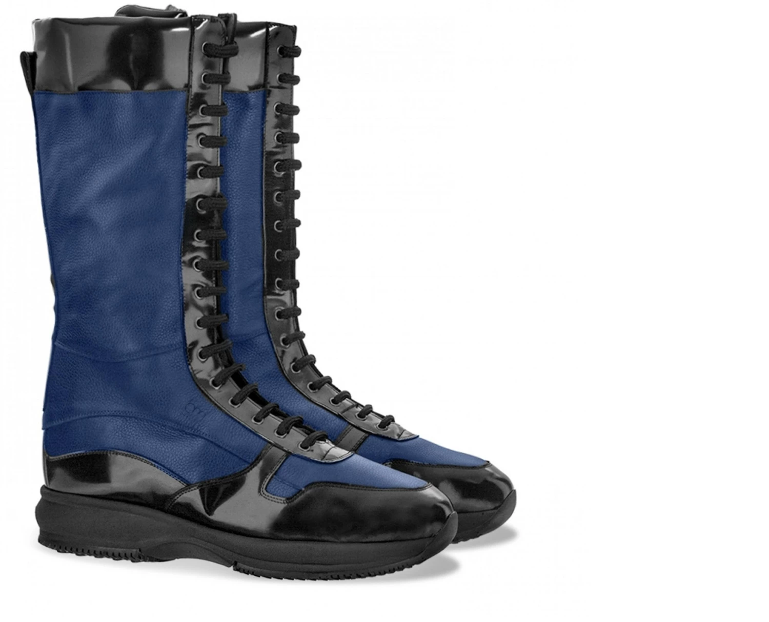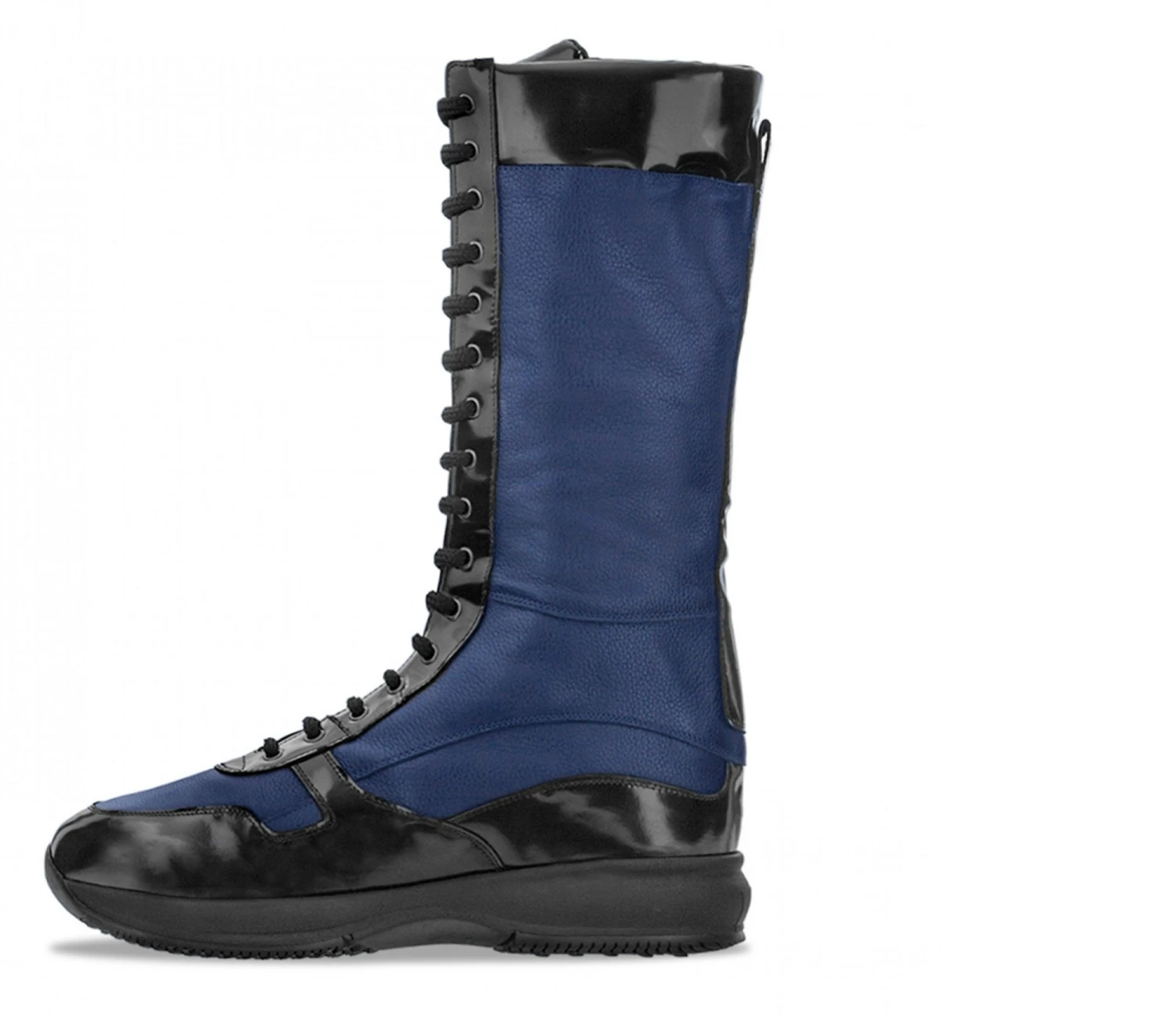 Walk of Fame: high leg sneakers in blue full-grain hammered leather and black shiny calfskin. The black sole is in ultra-light rubber. Shaft height: approximately 14 inches (depending on the size).