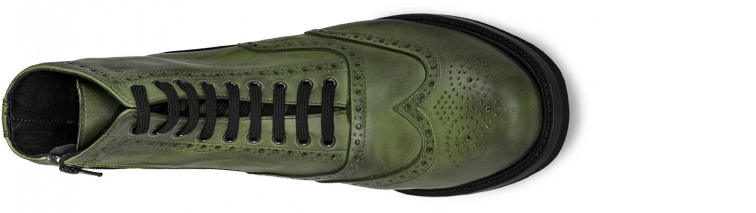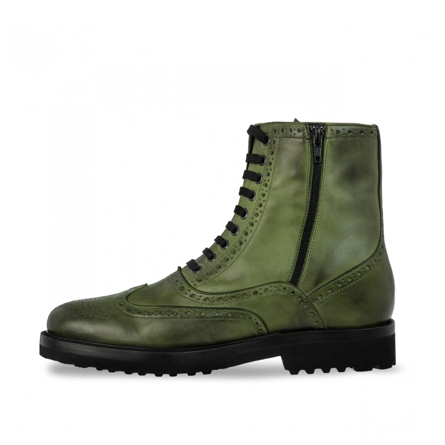 Handcrafted elevator boots with upper made of calf leather painted by hand featuring “deep mint” green nuance and durable black sole made of super light rubber. The full brogue punched by hand adds character to the wearer’s style.