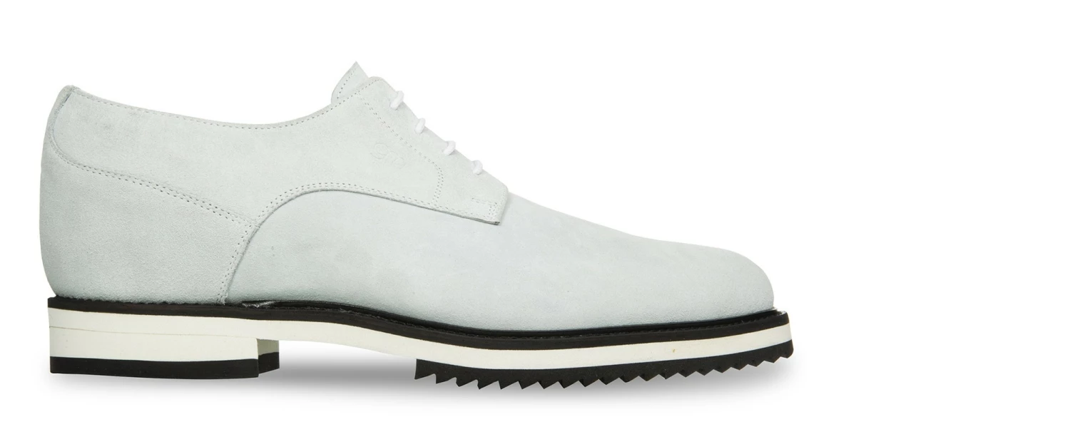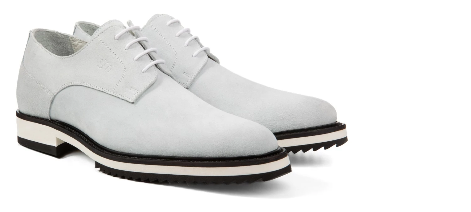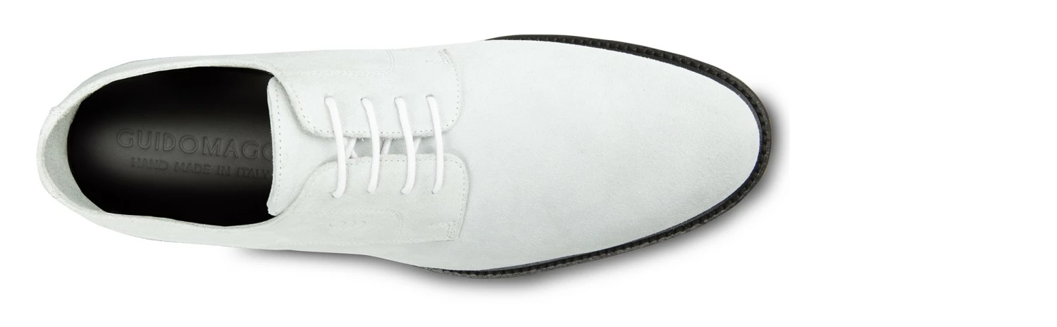 The class of the new GuidoMaggi Huwa elevator derby is unmatched in terms of design and artistry. The upper is white shade of soft suede calfskin. The details that make it even more exclusive, the trendy and super-light two-tone micro sole: here’s a comfortable shoe that can increase your height by up to 3.1”. Ideal for casual-chic outfits. Handmade in Italy.