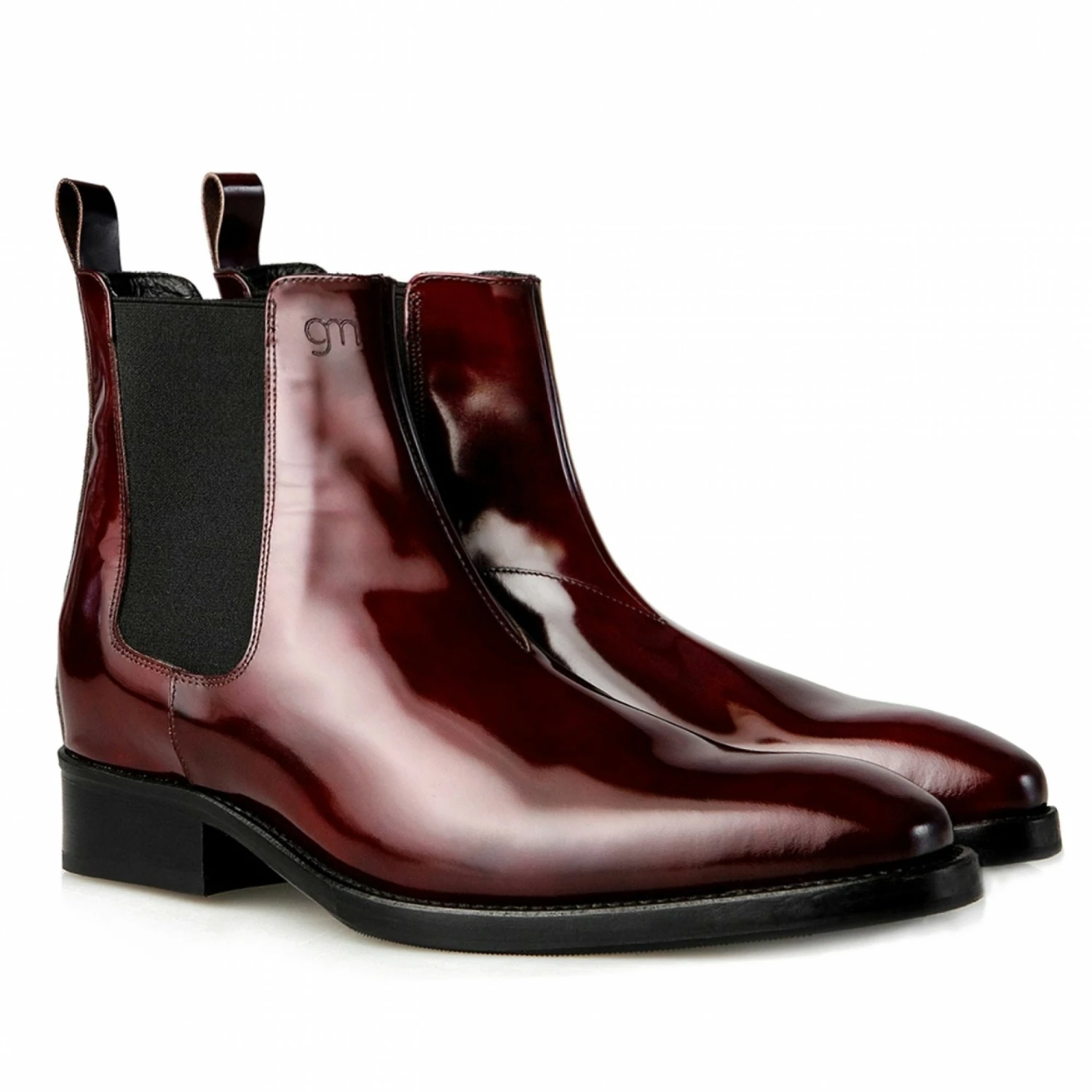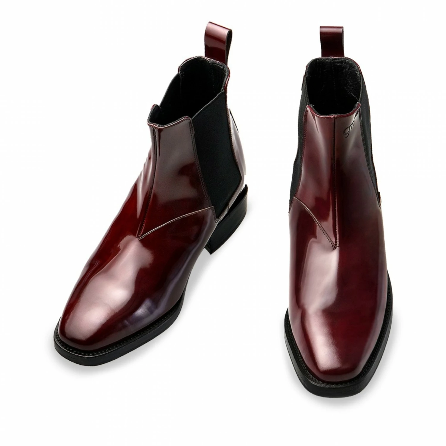 Upper in shiny bordeaux calfskin. Full soft leather lining. Upper leather, outsole and midsole are sewn at sight. Insole and midsole in genuine leather. Leather heel with special anti-slip rubber. Dual elastik silk panel for an easy, comfortable fit. Available with: Handcrafted leather outsole with special anti-slip rubber or High quality rubber sole anti-slip. Height increase: 2.4 in(6cm) or 2.75in(7cm) or 3.1in(8cm). Hand Made in Italy