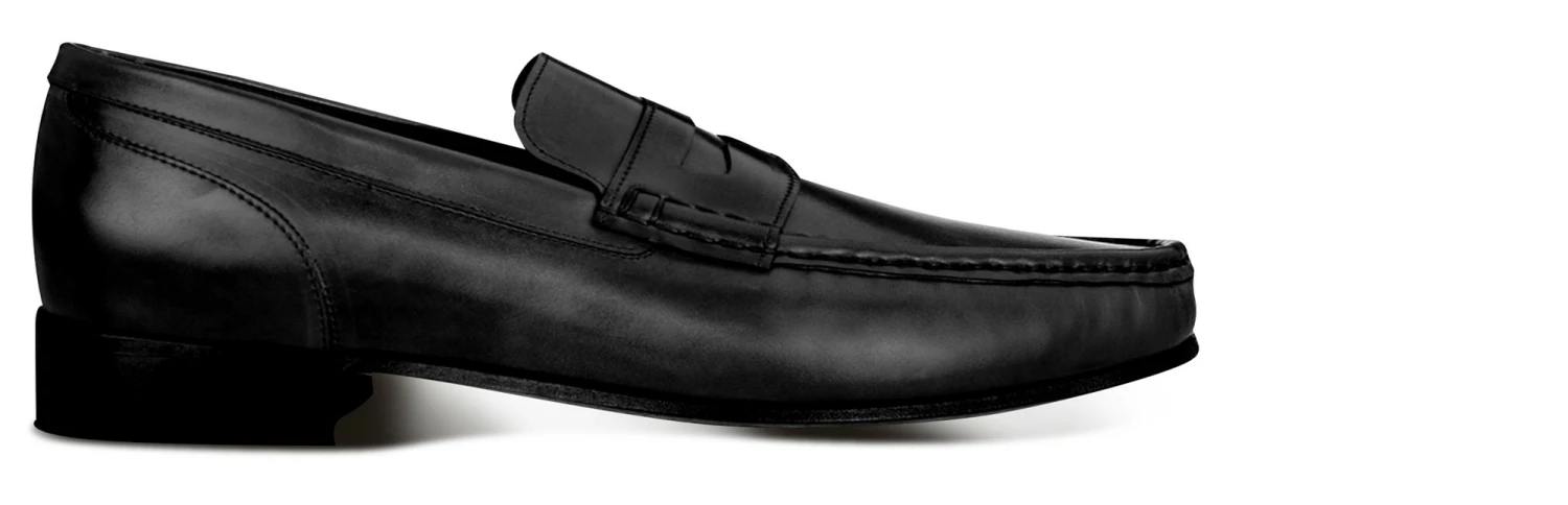 Refined and classy elevator loafers with clamp made of genuine shell cordovan leather featuring a deep black color and stiched leather sole with anti slip rubber.