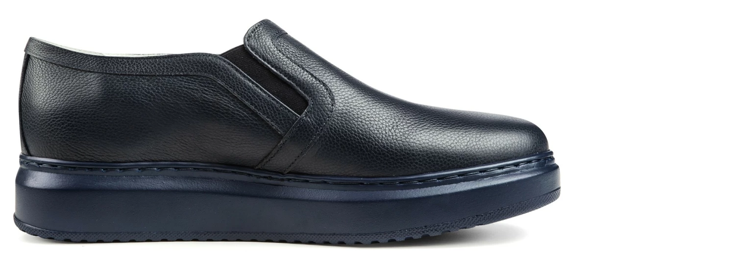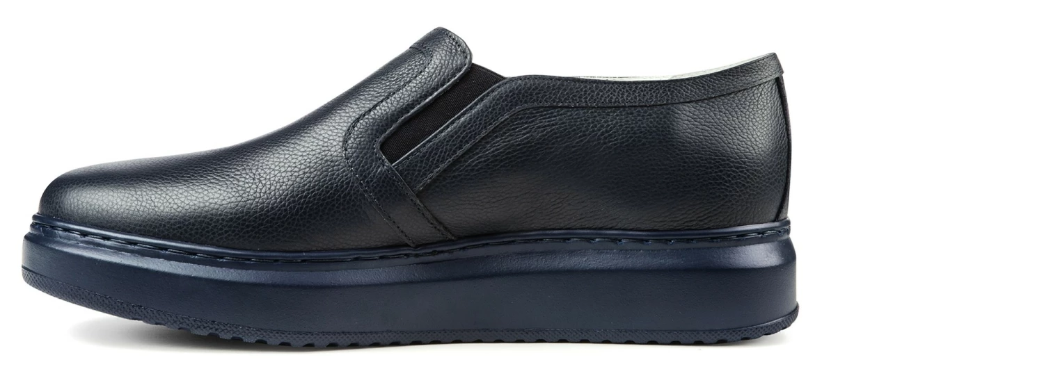 Handcrafted elevator slip-on made of blue tumbled calfskin and blue sole in ultra light natural rubber featuring a knurled effect.