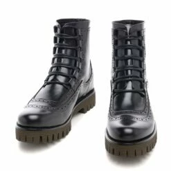 Stylish elevator boots, characterized by the upper in black brushed calfskin, hand-punched and by the innovative olive green track sole made of 100% natural rubber.