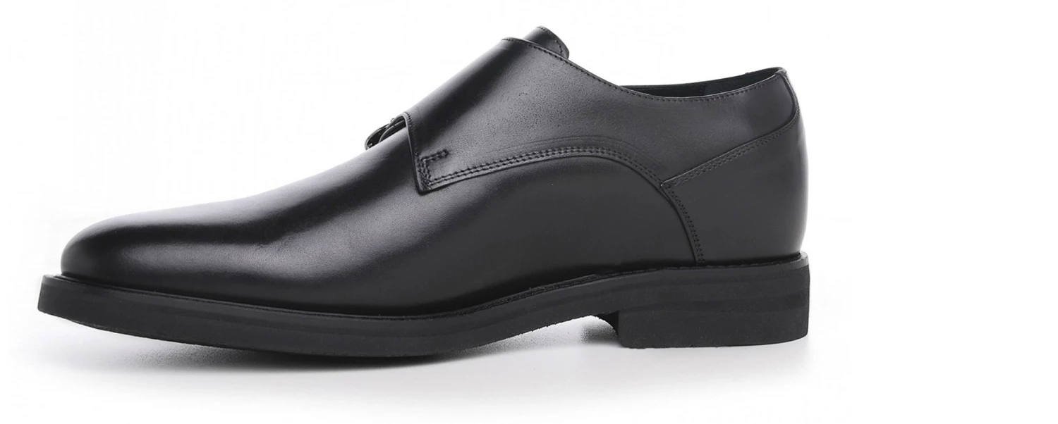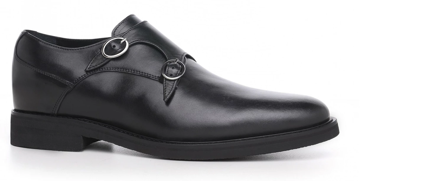 Elegant double buckle dress shoe with upper in soft black full grain leather with clean lines and a classic design.