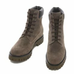 Handcrafted elevator boots with upper in fine brown suede, details in full grain dark brown leather and olive green rubber sole which ensures maximum comfort and durability.