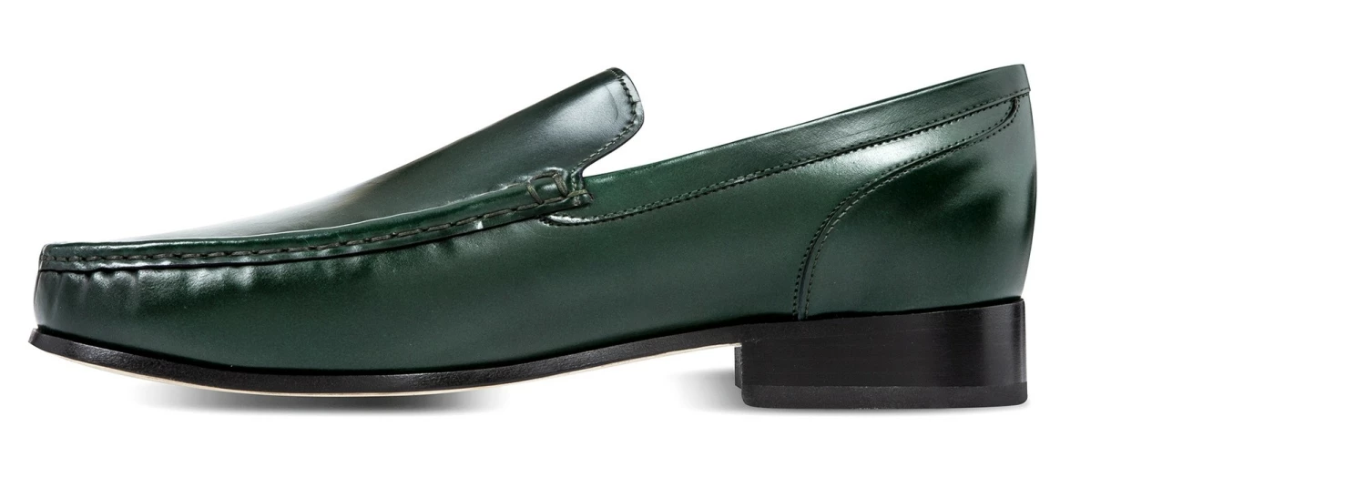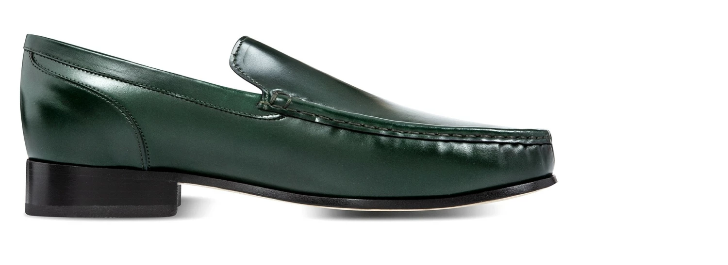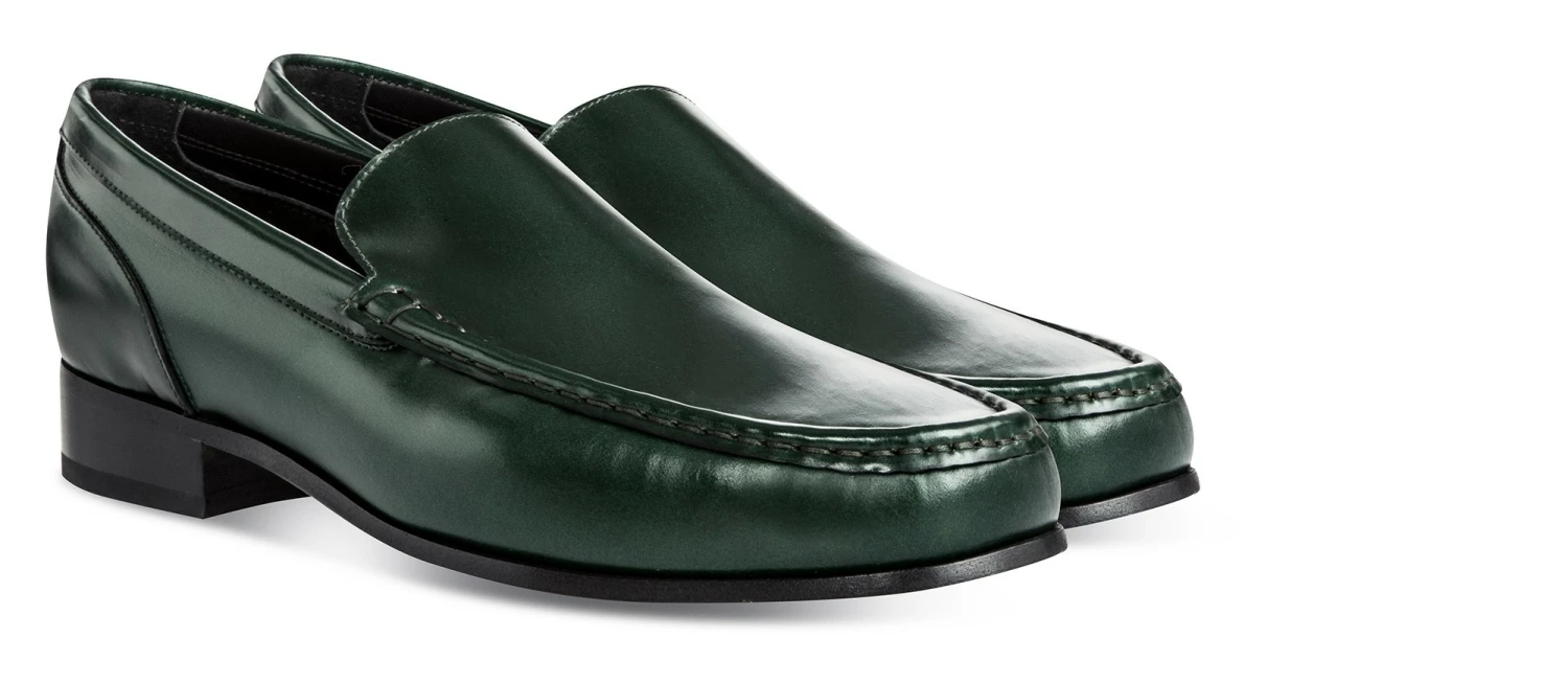 Luxury elevator loafers made of fine Shell Cordovan leather featuring a deep green color and Goodyear welted leather sole.