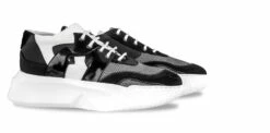 Inspired by the world of basketball, Jordan is a chunky elevator sneakers with upper made using 6 different materials: suede and brushed black calfskin, white and black rubberized leather, perforated steel gray fabric and black full-grain Tuscan vegetable-tanned leather. The white sole is made of super-light natural rubber.