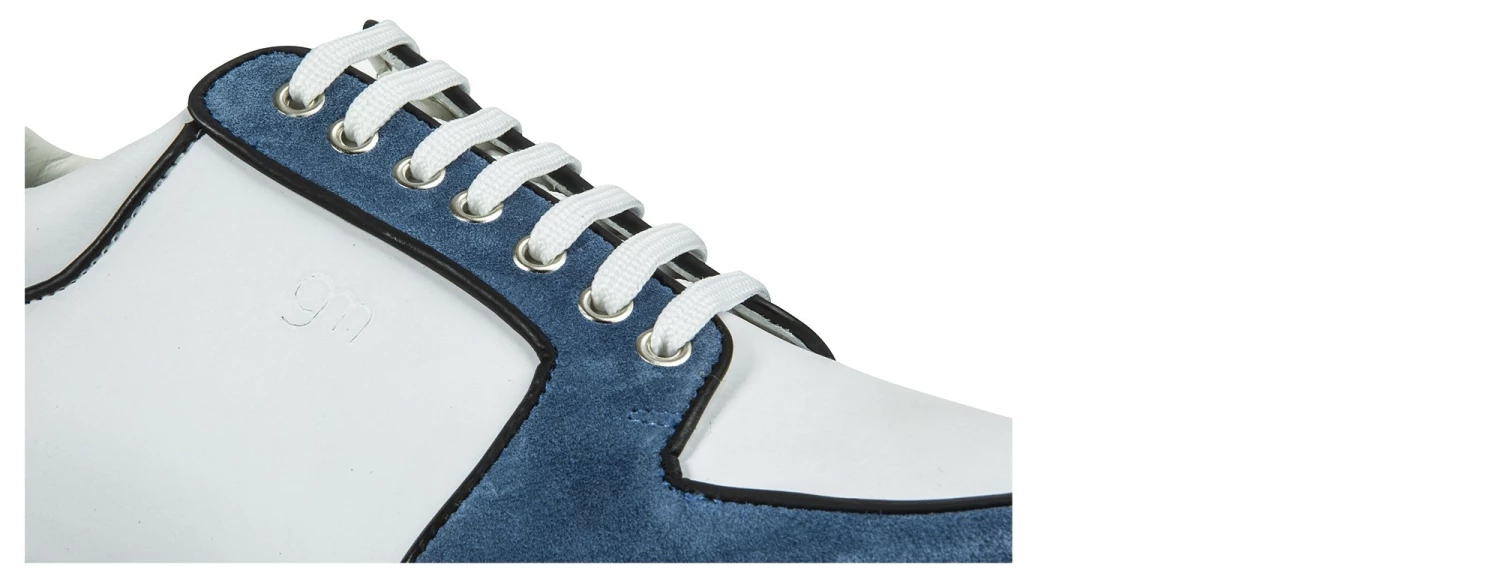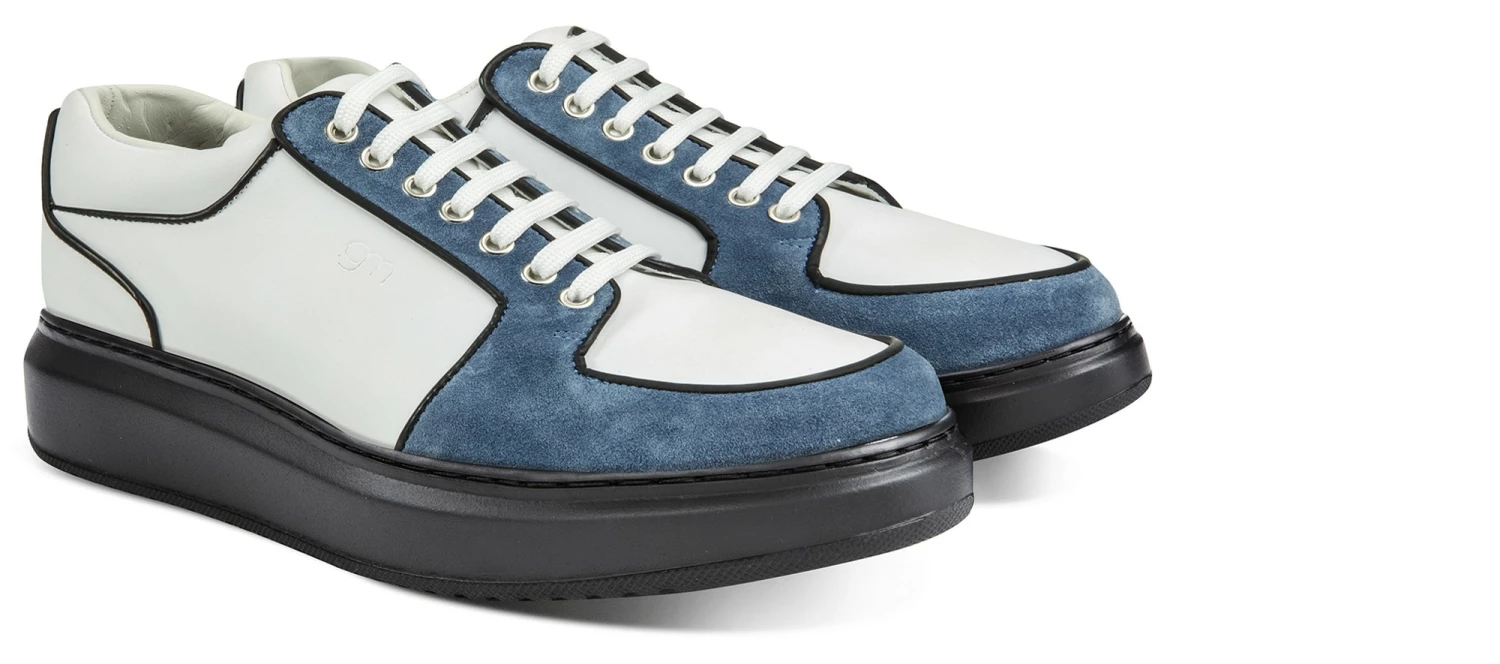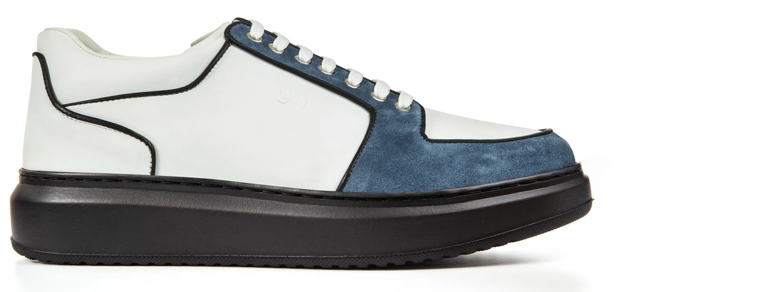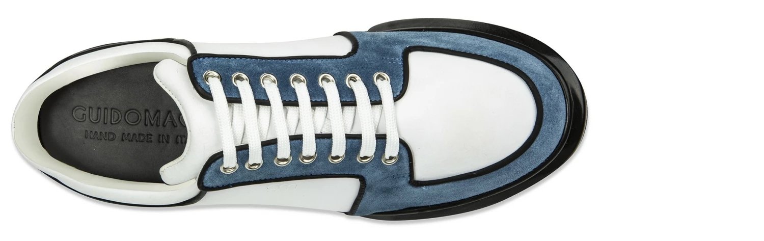 The exclusive new edition elevator sneakers by GuidoMaggi is a celebration of sporty-chic style. An elevator model with soft shapes and clean lines. The upper is in white rubberized calf leather with black details, while the front is in suede featuring a particular shade of blue.