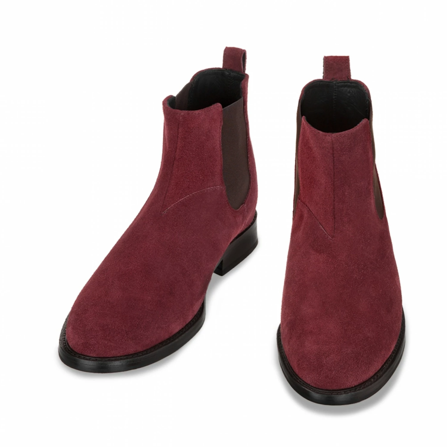 Modern reinterpretation of the classic Beatle Boots with upper in fine burgundy suede and stiched leather sole with anti slip rubber.