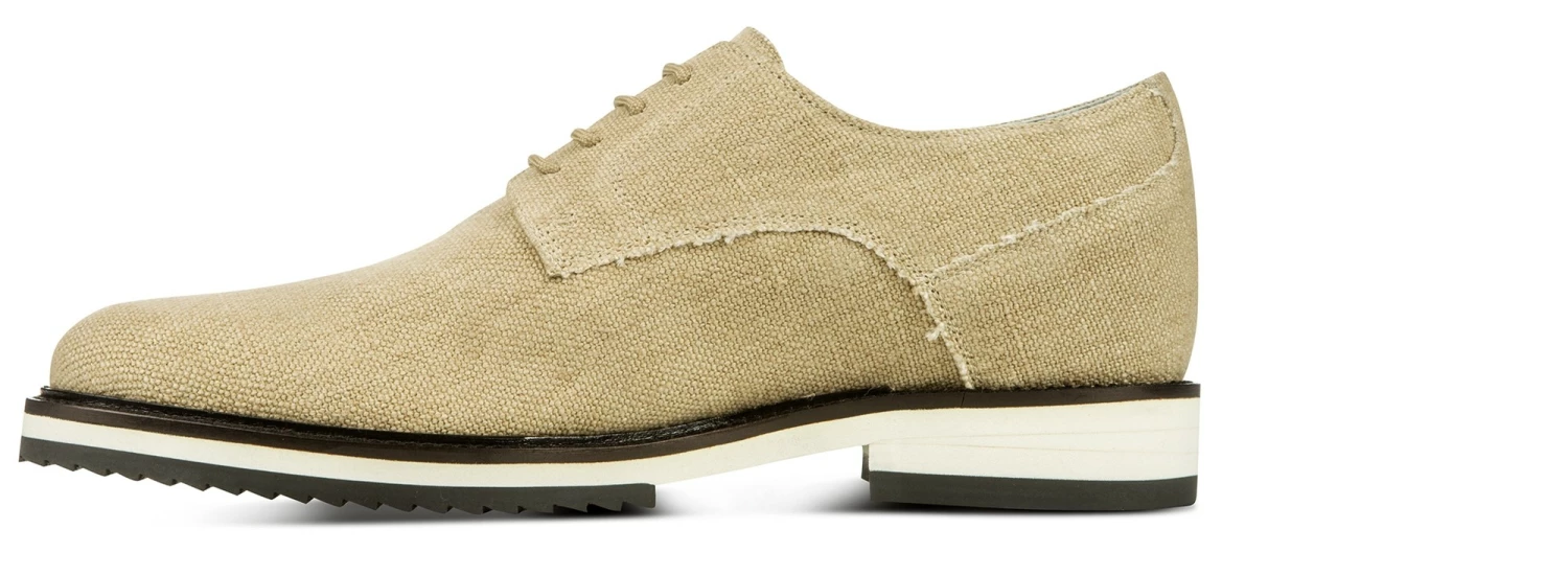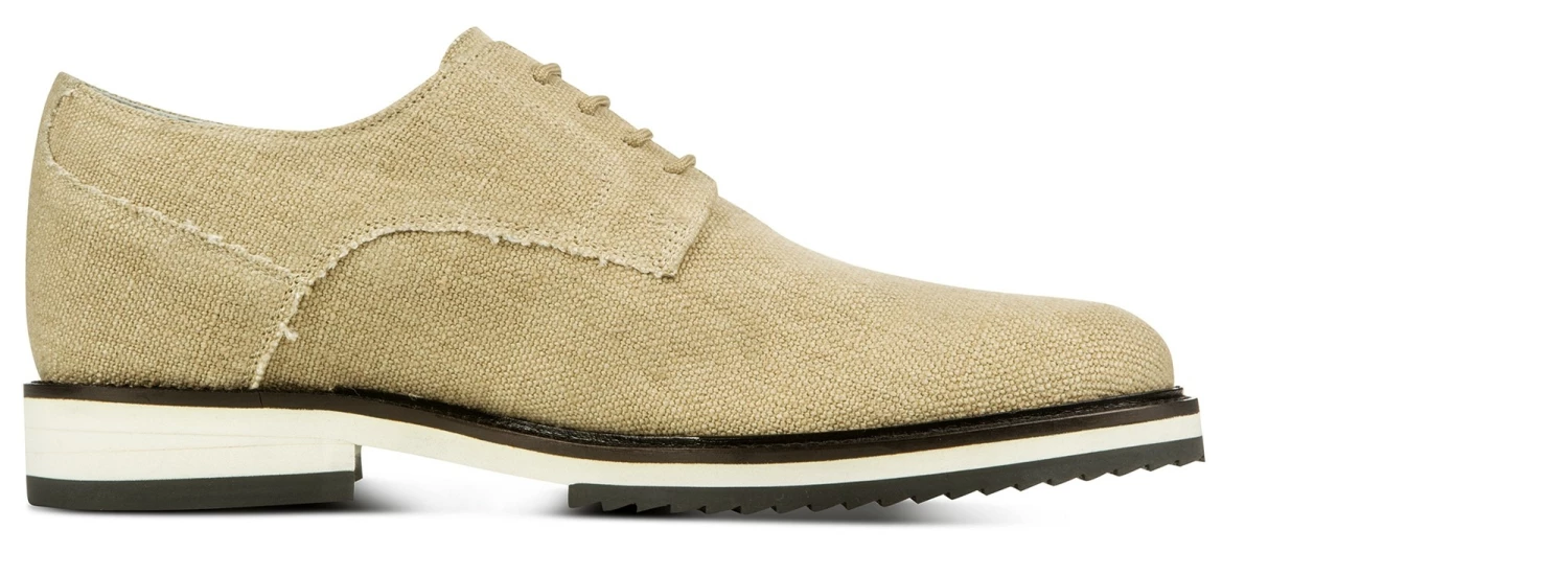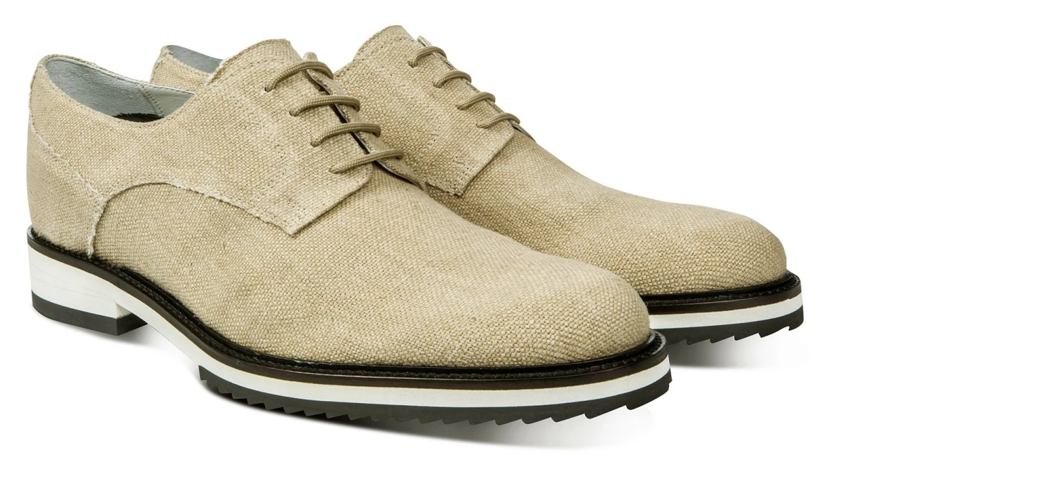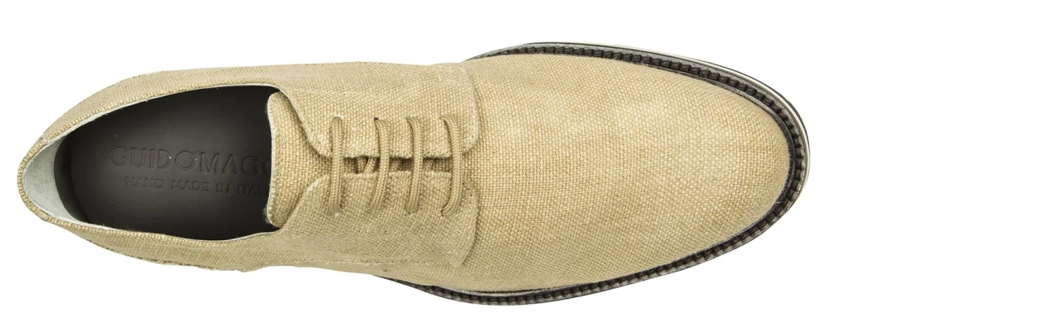 This elevator derby from the new spring-summer collection by GuidoMaggi is an excellent classic revisited in a contemporary style. The upper is in natural raffia, in the shade of beige, and makes it fresh and elegant at the same time. The calfskin lining and the two-tone black and white sole complete the exclusive style of this new lift model.