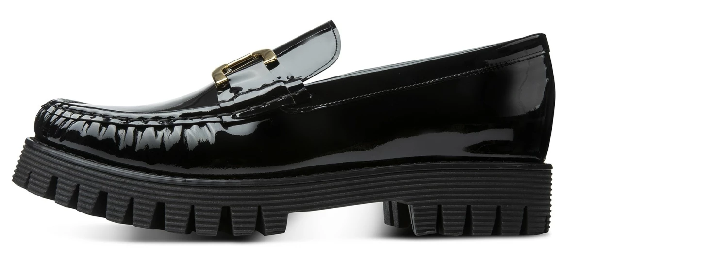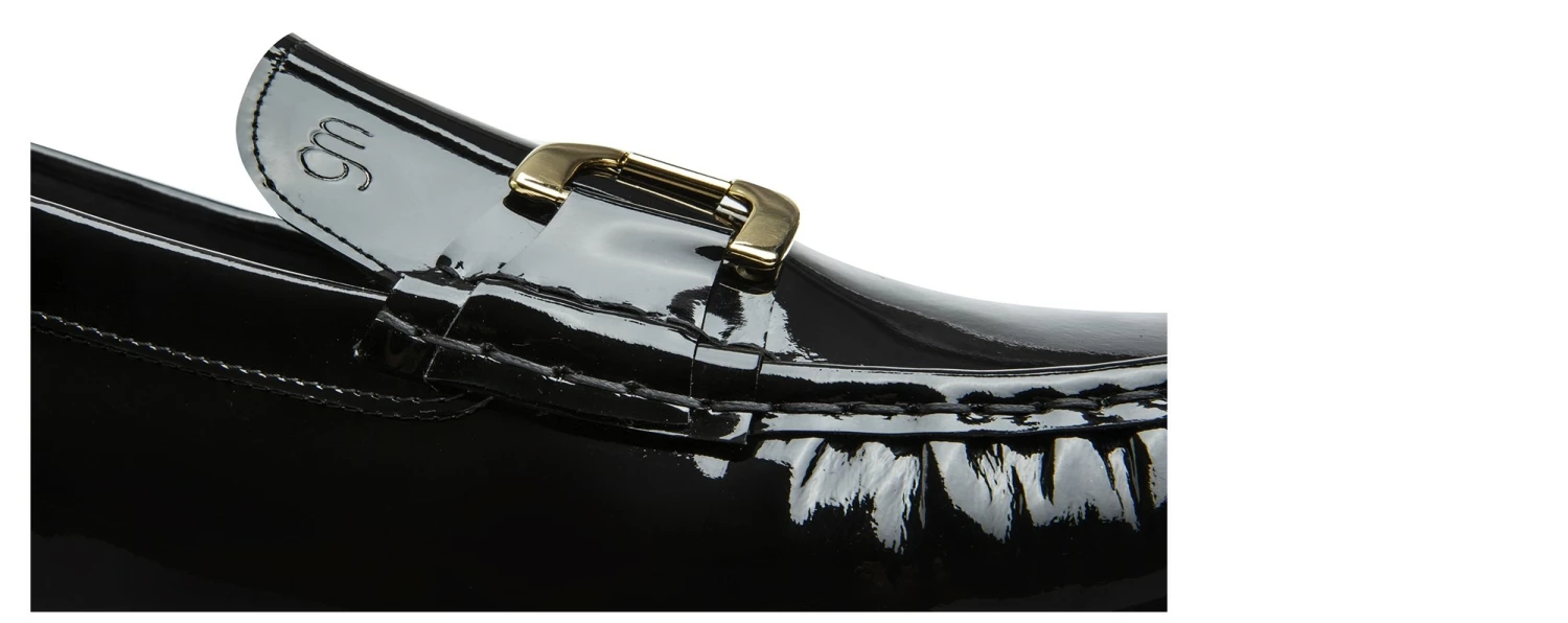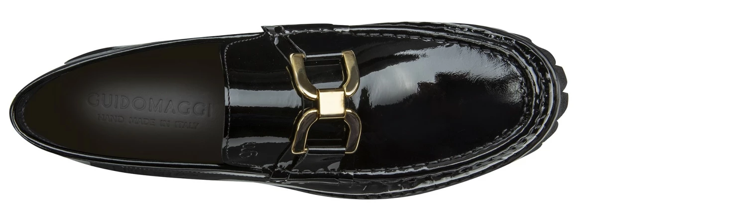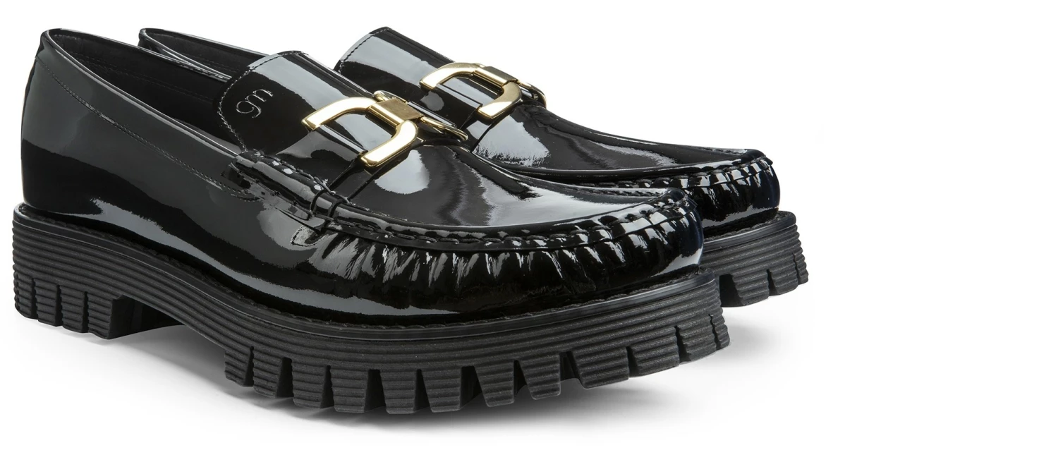 Contemporary reinterpretation of the classic elevator loafers with upper in black patent leather, elegant golden plated clamp and tone-on-tone ribbed sole in superlight rubber.