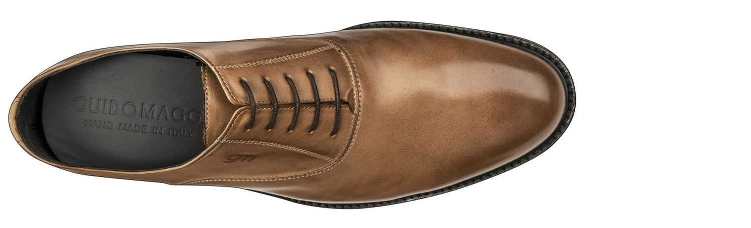 The charm of a classic model relives thanks to the talent of GuidoMaggi artisans. Elegant and exclusive elevator oxford shoes with upper made of calf leather with a patina effect. The real leather sole with anti slip rubber is dark brown. Handcrafted and tailored to perfectly adhere to your style, it has an elevator system able to increase height up to 3.1 inches (8 cm). 100% made in Italy.