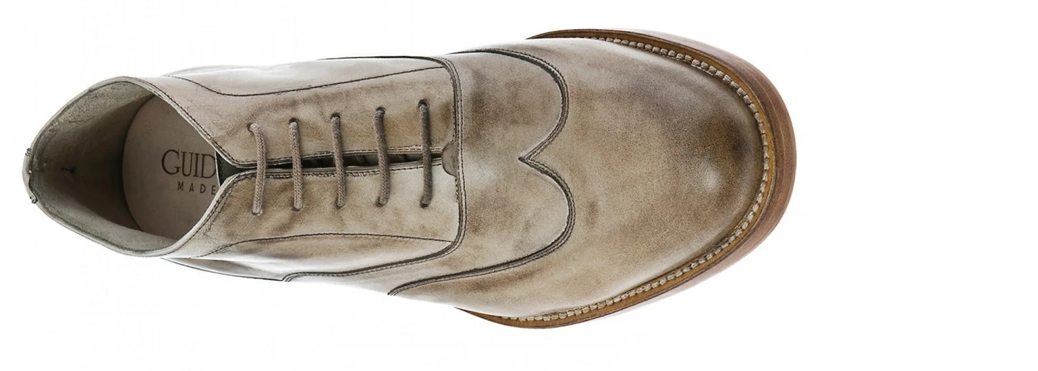 Upper in full grain leather light brown burnished. Lining in soft goatskin. Upper leather, outsole and midsole are sewn at sight. Insole and midsole in genuine leather. Leather heel with special anti-slip rubber. Cotton waxed shoe laces. Handcrafted leather outsole with special anti-slip rubber. Height increase: 2.4 in(6cm) or 2.75in(7cm) or 3.1in(8cm). Hand Made in Italy