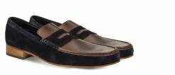Two-tone elevator penny loafers with upper made of soft blue suede and brown calf leather on the front stitched at sight. The natural leather sole with anti-slip rubber is GoodYear stitched.