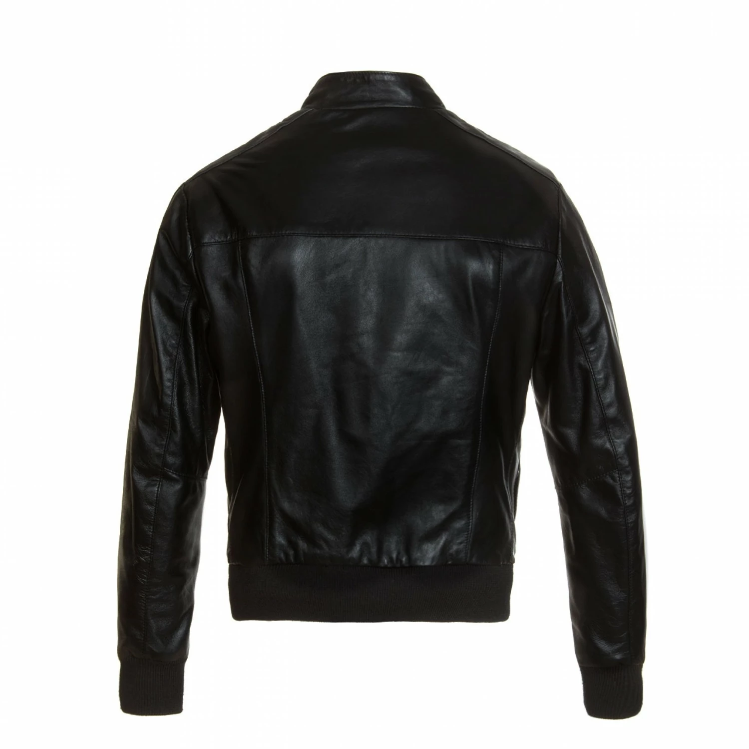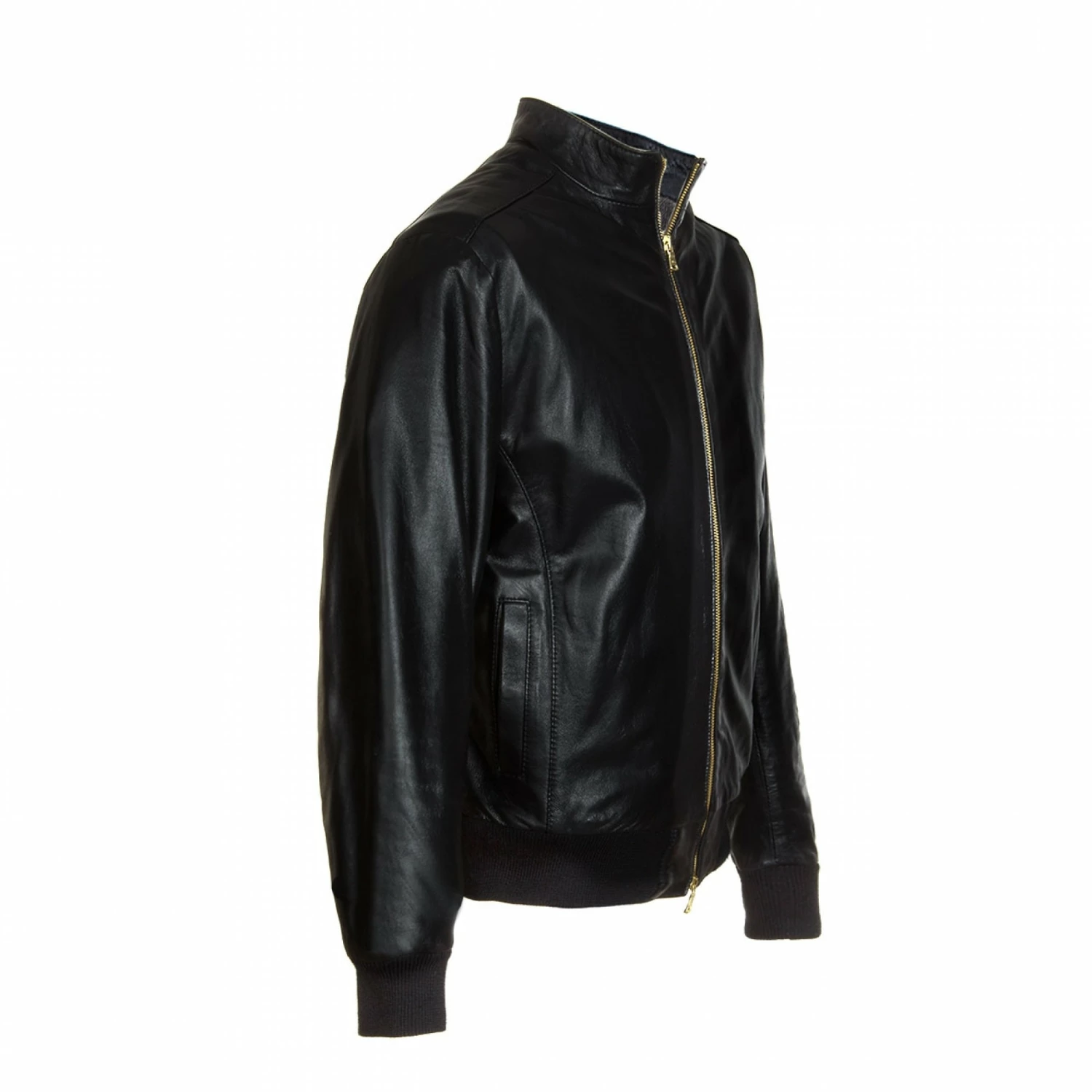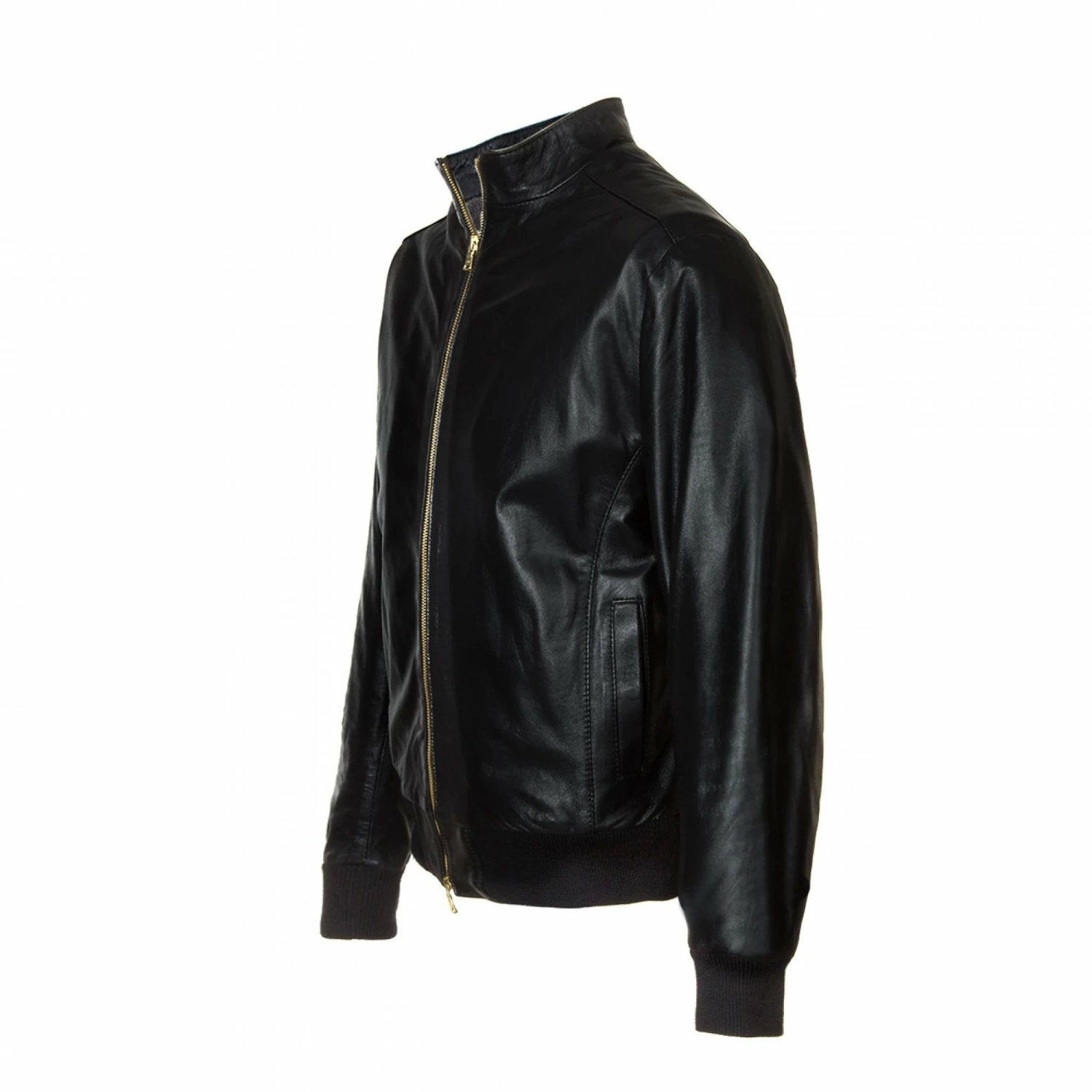 Must have piece in every men’s wardrobe this bomber leather jacket inspired by the biker style is made of black nappa leather and customizable silk inner lining. Its particular cut and shape will give you a slender apperarance. Zip fastening, two side pockets, and internal pocket. Ribbed knit tone on tone cuffs and bottom hems. Handcrafted in Italy.