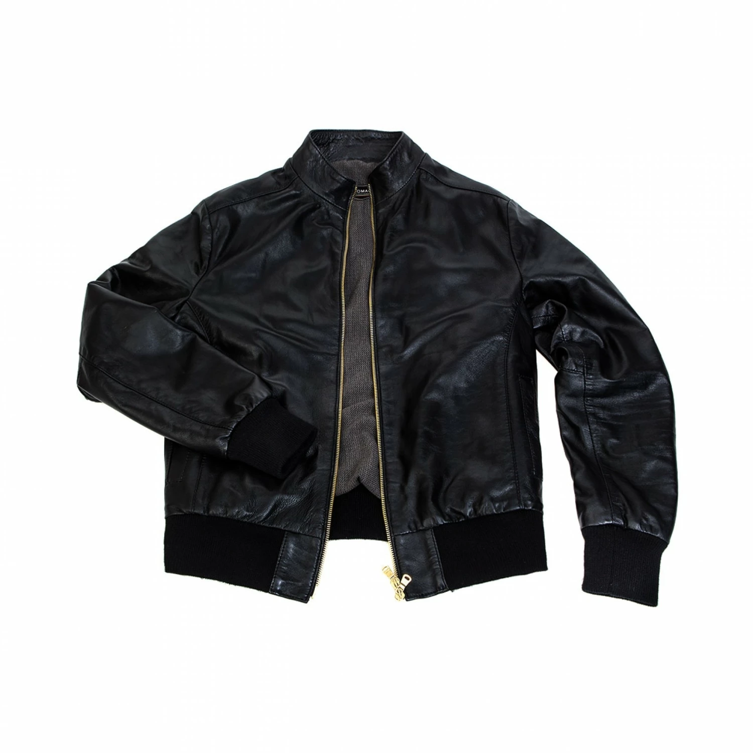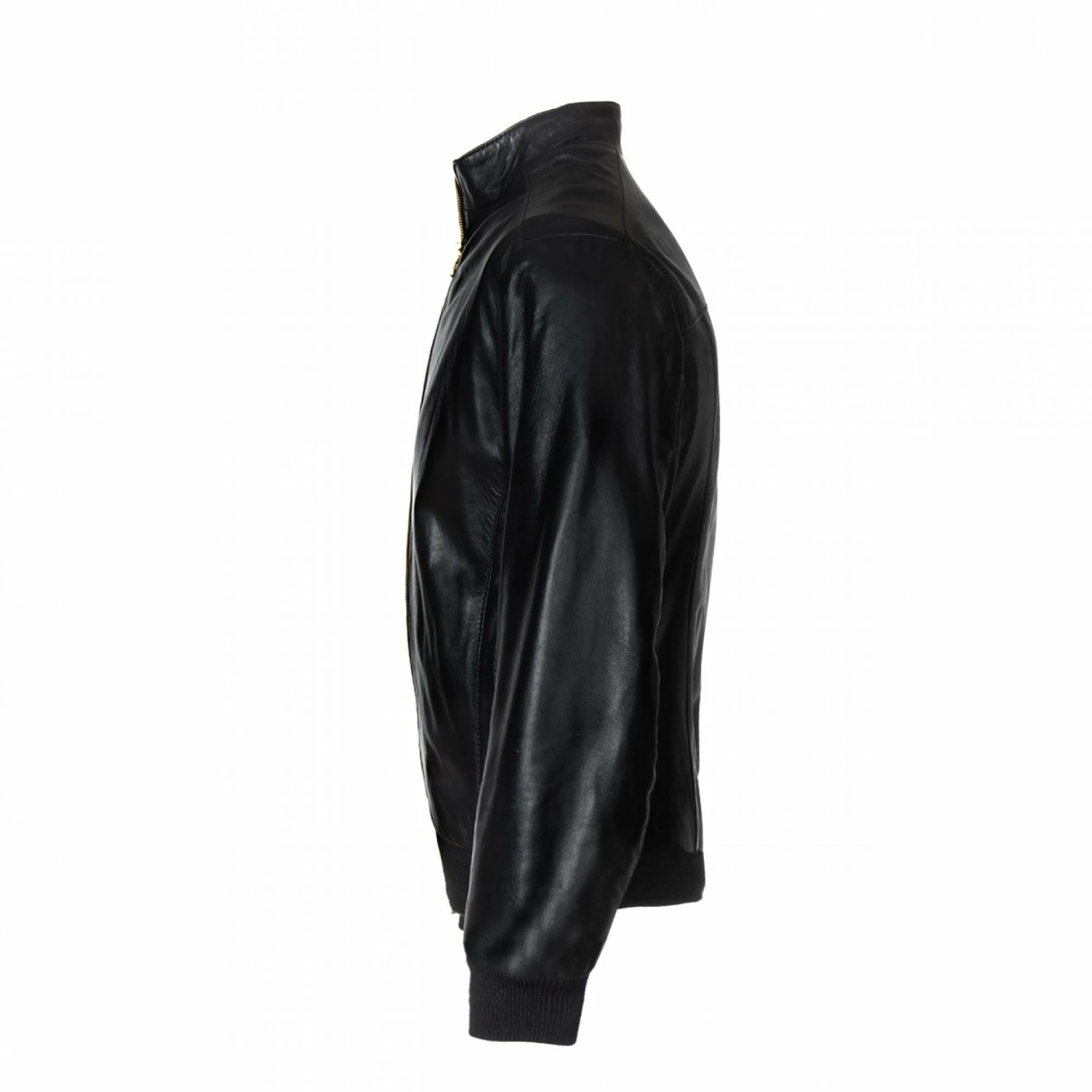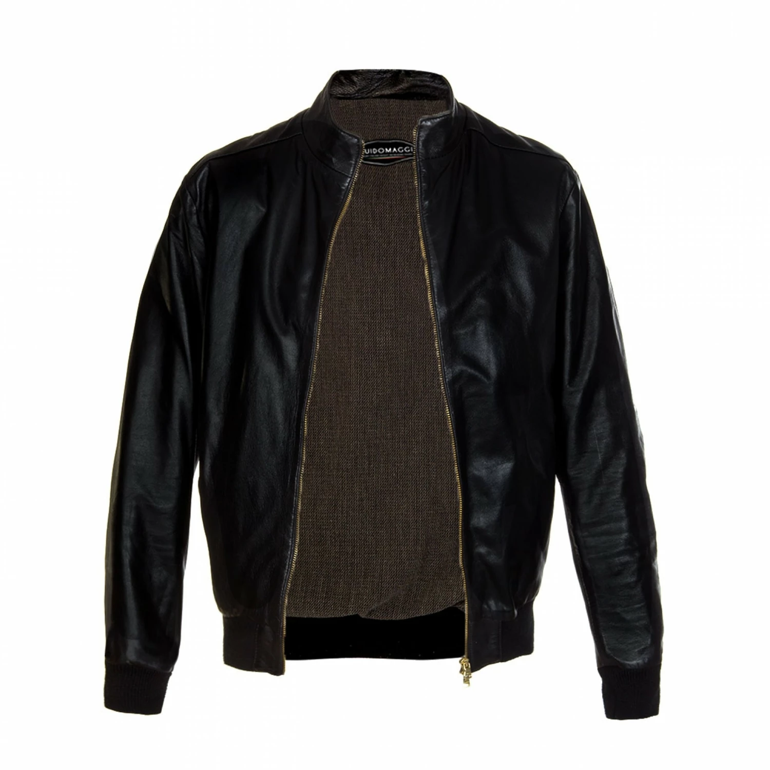 Must have piece in every men’s wardrobe this bomber leather jacket inspired by the biker style is made of black nappa leather and customizable silk inner lining. Its particular cut and shape will give you a slender apperarance. Zip fastening, two side pockets, and internal pocket. Ribbed knit tone on tone cuffs and bottom hems. Handcrafted in Italy.