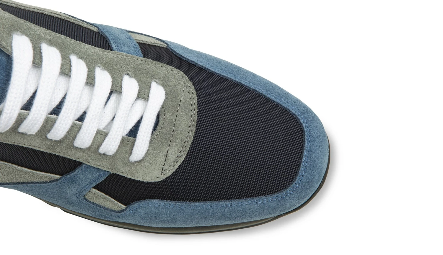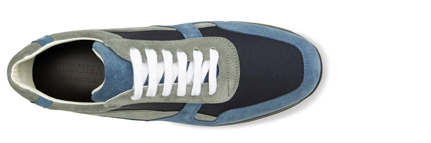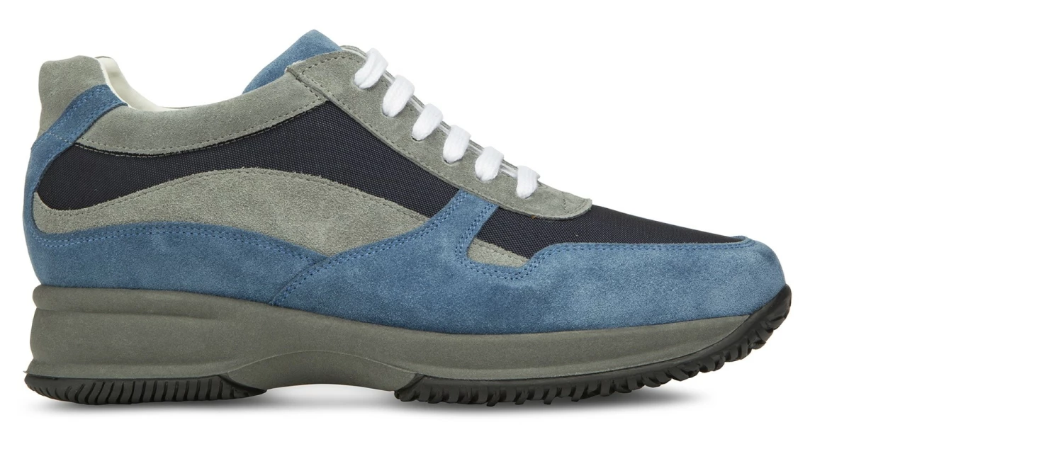 Handcrafted elevator sneakers with upper in navy blue technical fabric and grey and dark blue suede. Ultralight rubber sole in dark grey.