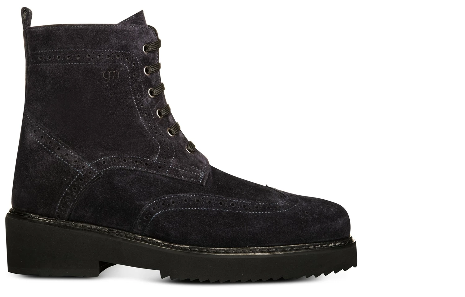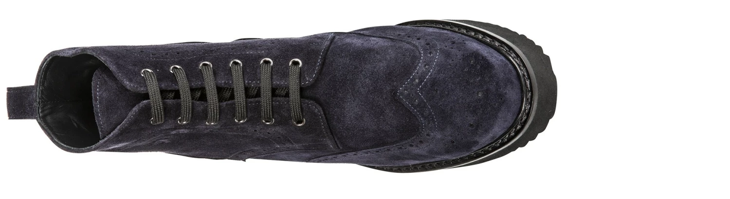 Boots with inner elevator system able to increase height by up to 6 inches (15 cm) featuring upper in hand punched navy blue suede and extra light and durable sole.