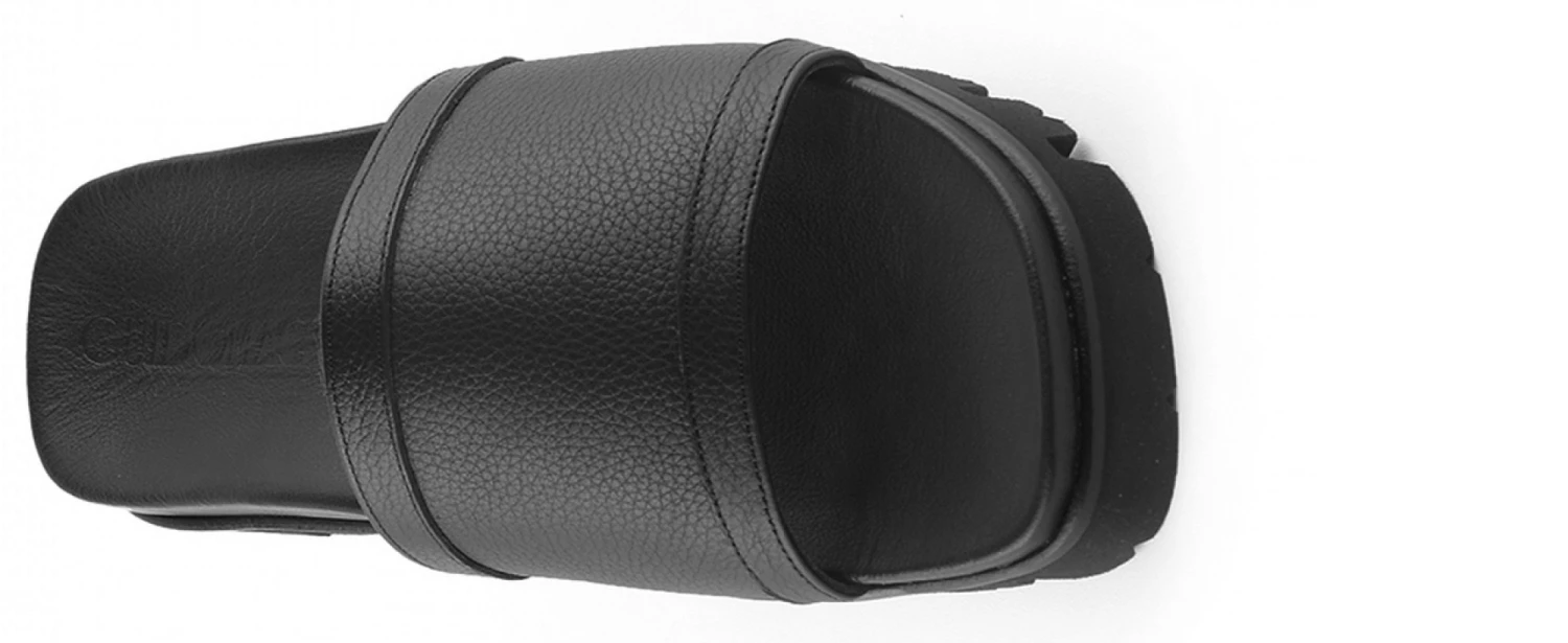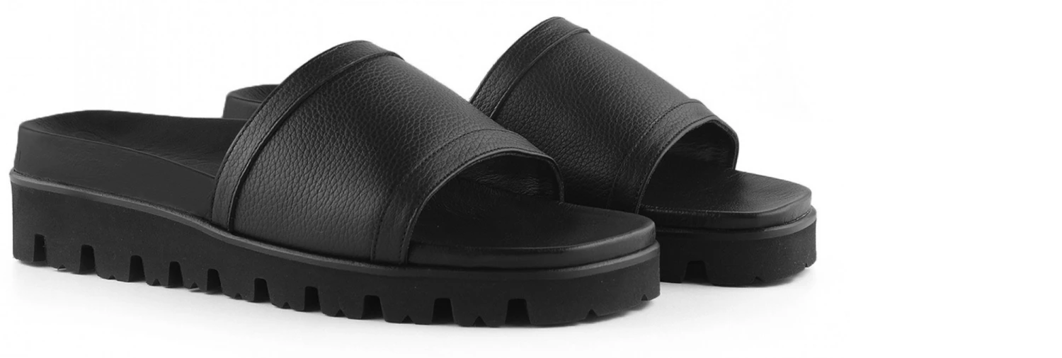 Handcrafted elevator sandals with upper in black full grain leather, lightweight tank tread sole in natural rubber and comfortable leather-covered insole.