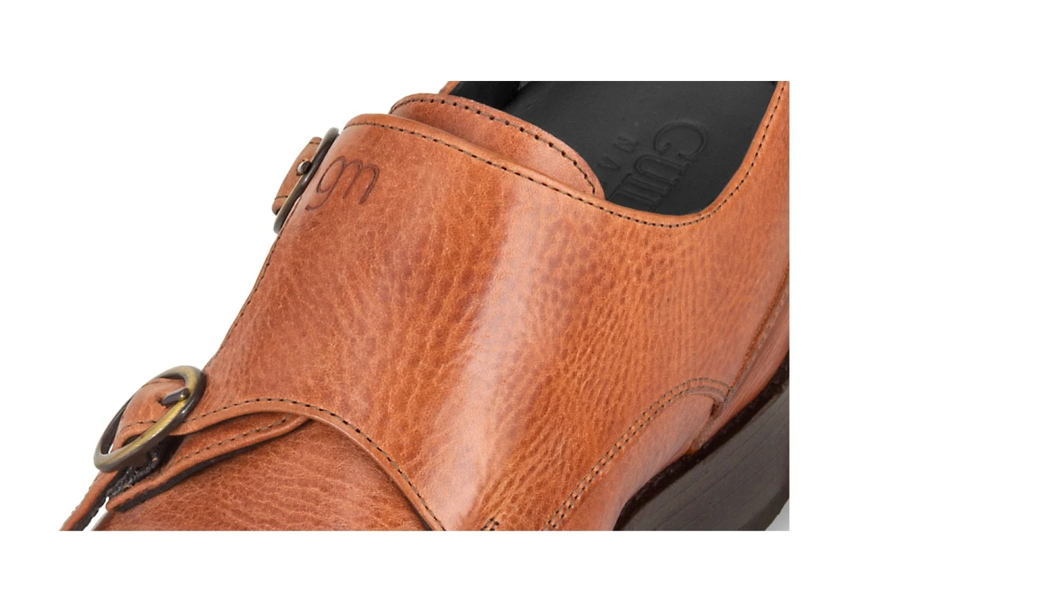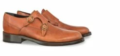 Classic timeless: double monk strap elevator shoes made of vegetable tanned cognac Tuscan full-grain leather. The natural grain of the skin gives the shoe a charismatic aged look. Golden buckles and sole in dark brown leather with anti-slip rubber stitched at sight.