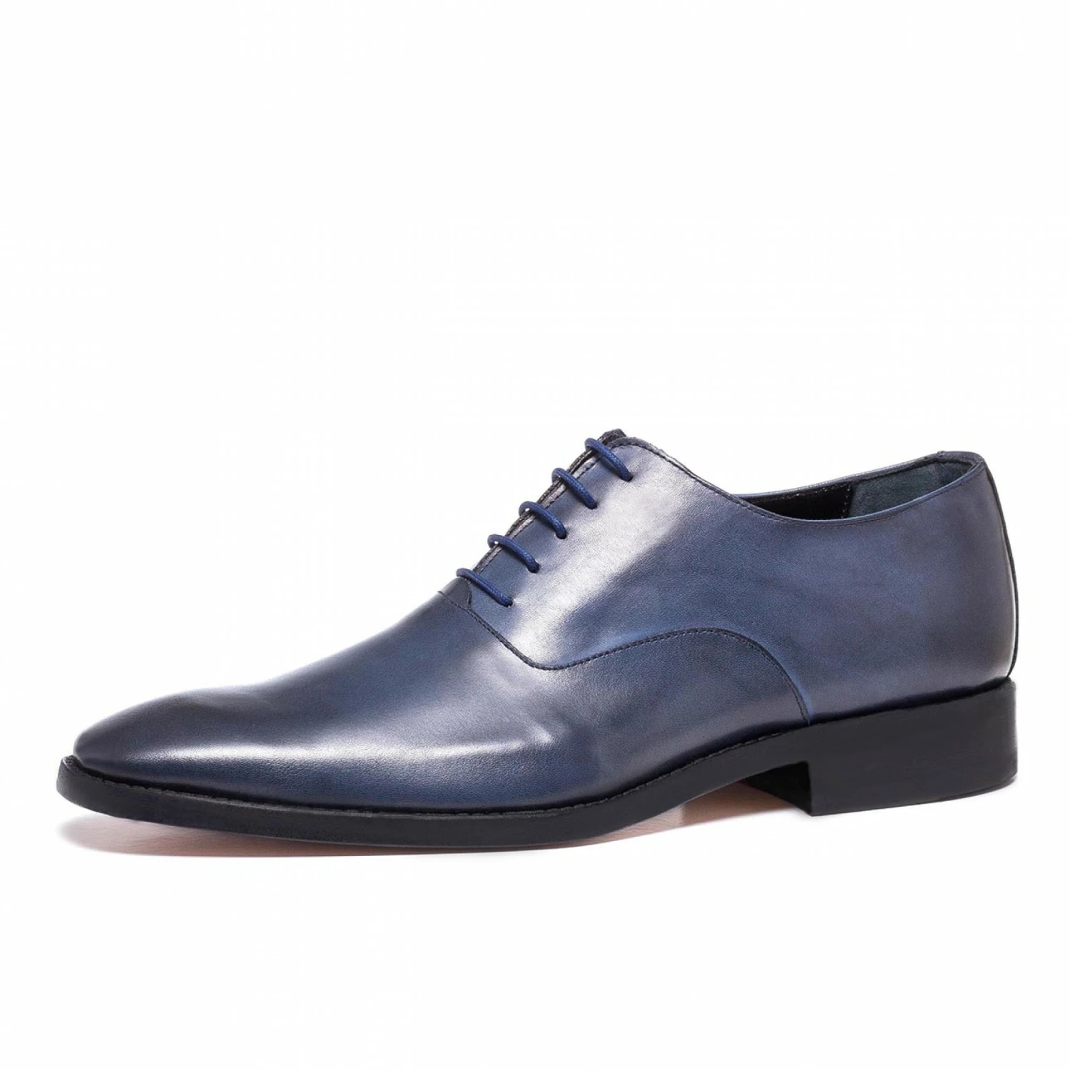 Refined elevator dress shoe featuring a distinctive color obtained through a sophisticated craft process that enhances the upper in full grain leather with unique black and blue shades and reflections: an elegant and balanced effect that enriches its design and texture.