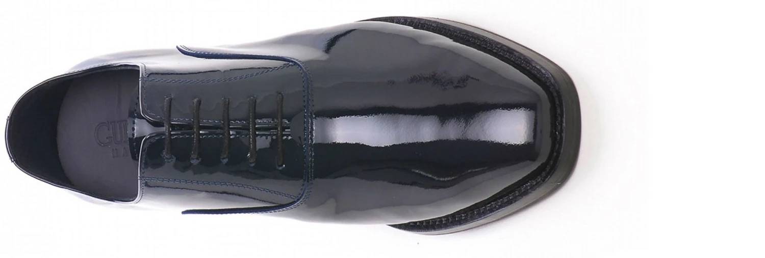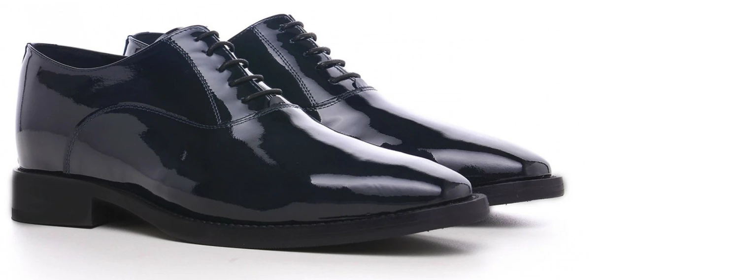 Elegant dress shoe with blue patent leather upper and stiched leather sole with anti slip rubber.