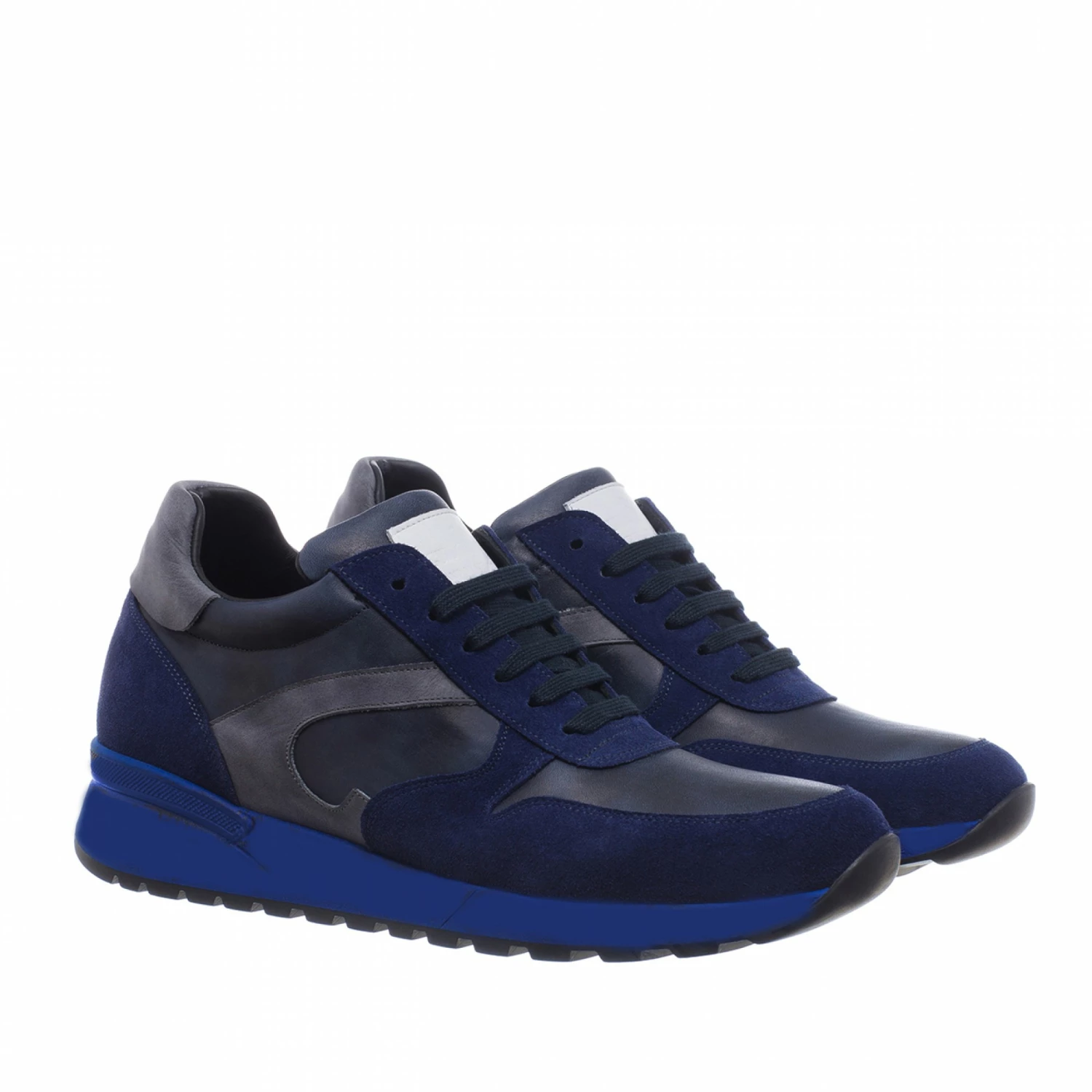 Sporty elevator sneakers with upper in soft blue suede embellished by elegant details in dark blue buffered calfskin and grey full grain leather on the sides and back. The blue sole is made of 100% natural rubber.