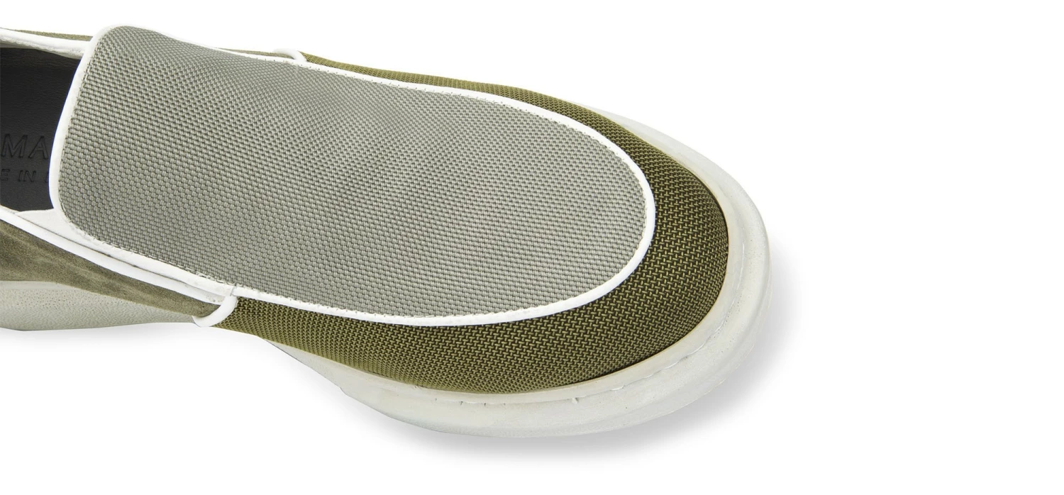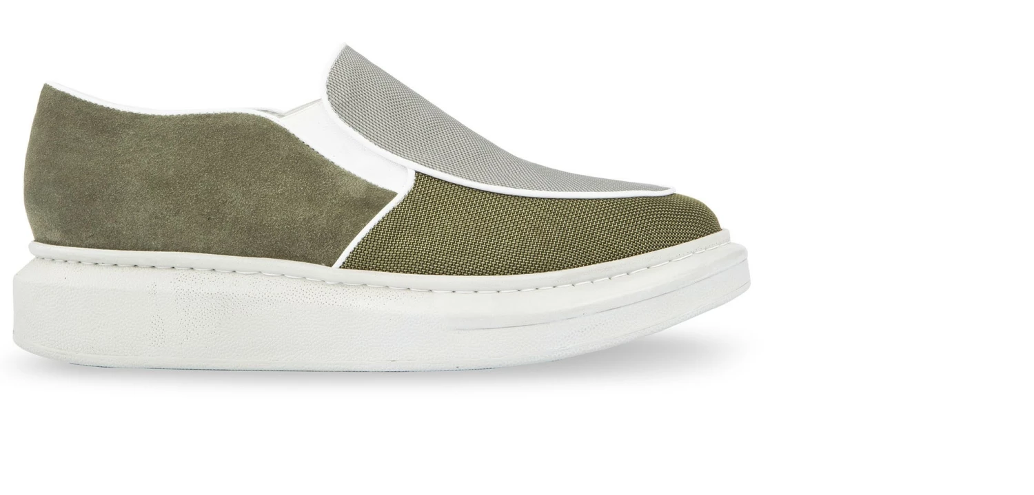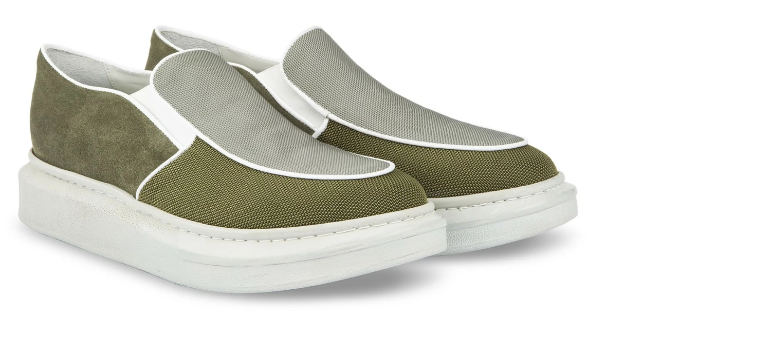 An elevator slip-on with upper in breathable green and grey fabric alternating with suede, embellished with borders and details in white full-grain leather. The new and resistant all-white sole is in super light natural rubber for truly unique comfort. A trendy sneaker without laces, with a great fit, is a must-have for the summer season. It’s a lifting model that can increase your height to 2.56″, in total discretion. 100% made in Italy.