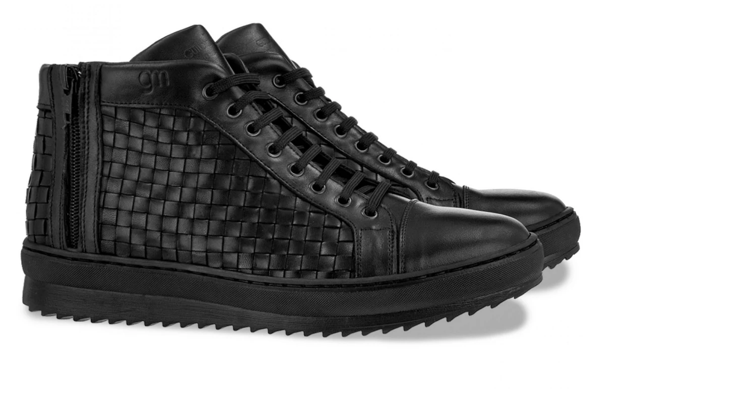 Total black mid-top elevator sneakers with upper made of black calf leather and tone on tone hand-painted braided calfskin. The sole is made of extralight natural rubber.