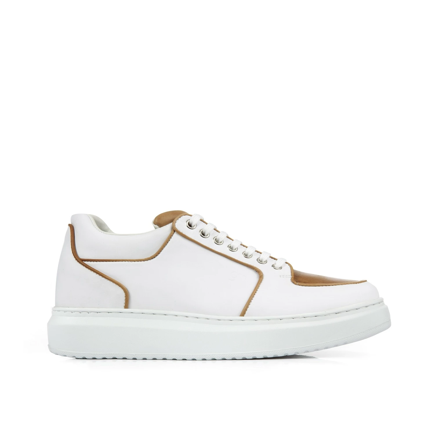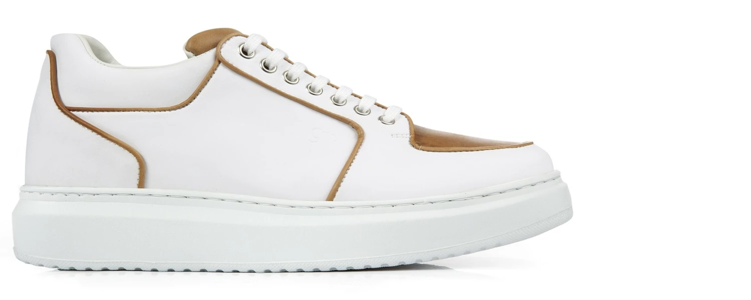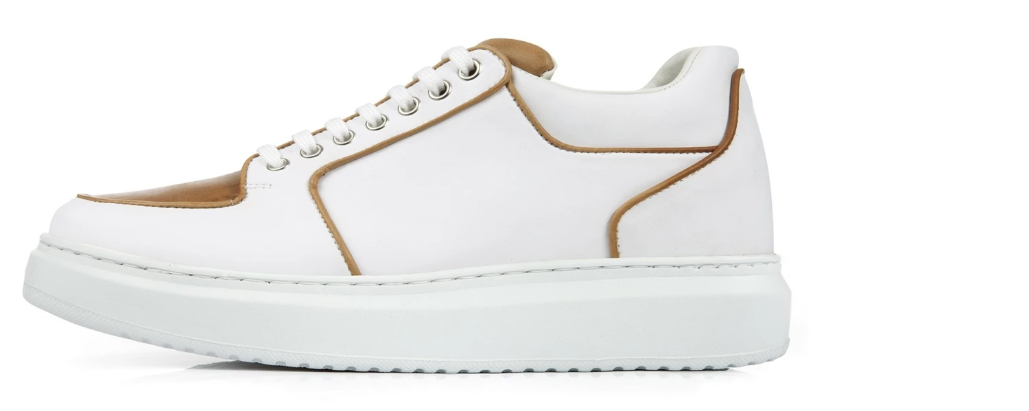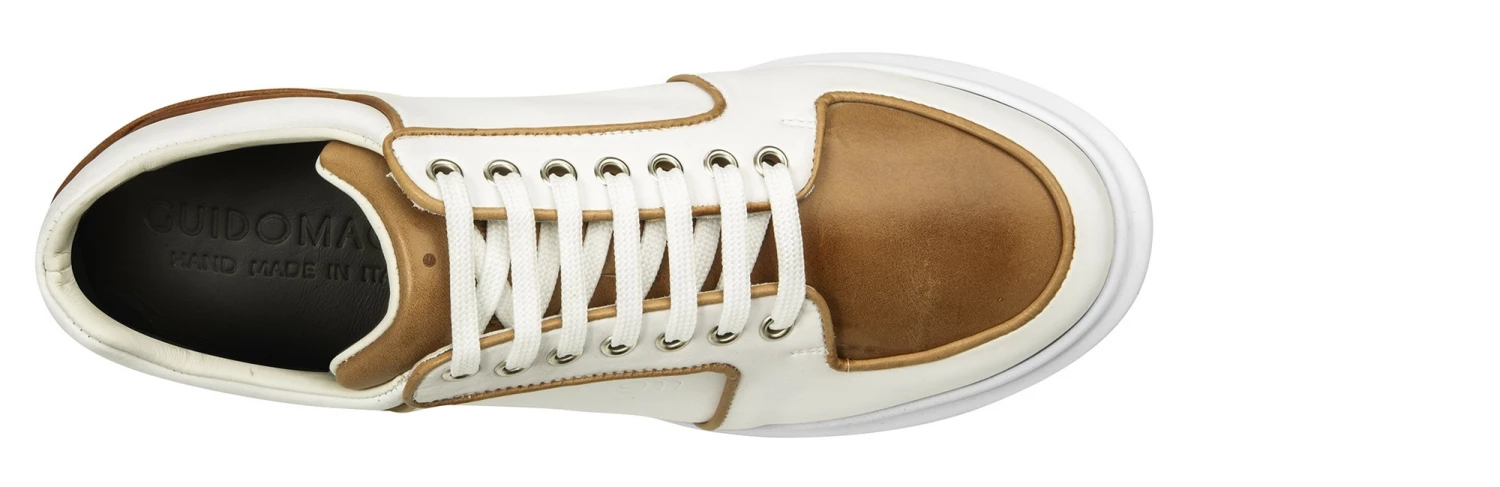 Dynamic and captivating, the new GuidoMaggi elevator sneakers for men are a masterpiece of style. The upper is made of soft rubberized white calfskin and brown vegetable tanned full-grain leather. A very springy and fresh elevator model, ideal for any casual chic outfit. The ultra-light and comfortable white sole is in natural rubber. Up to 3.1 inches (8 centimetres) of extra height in total comfort and discretion, 100% handmade in Italy.
