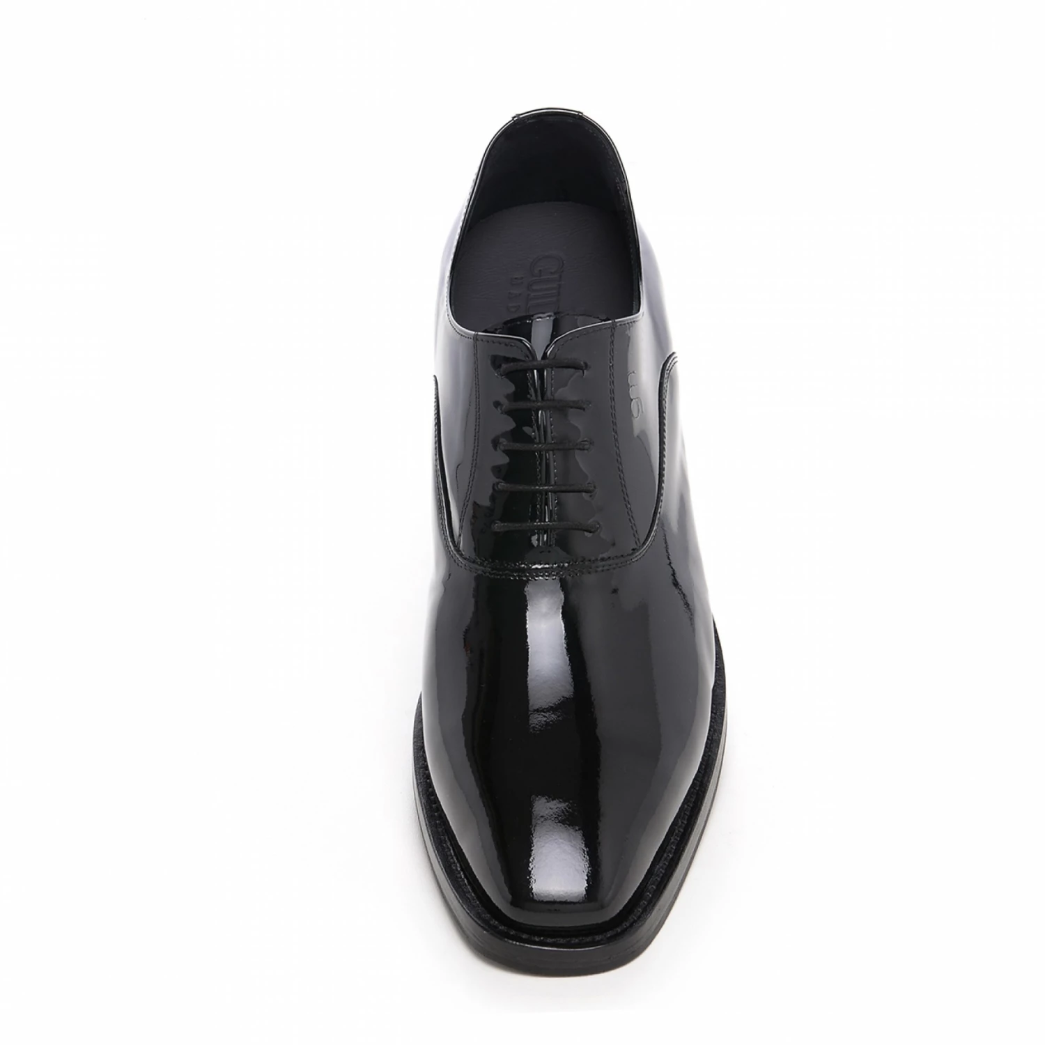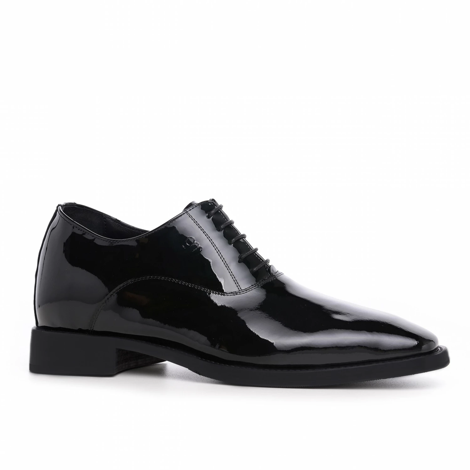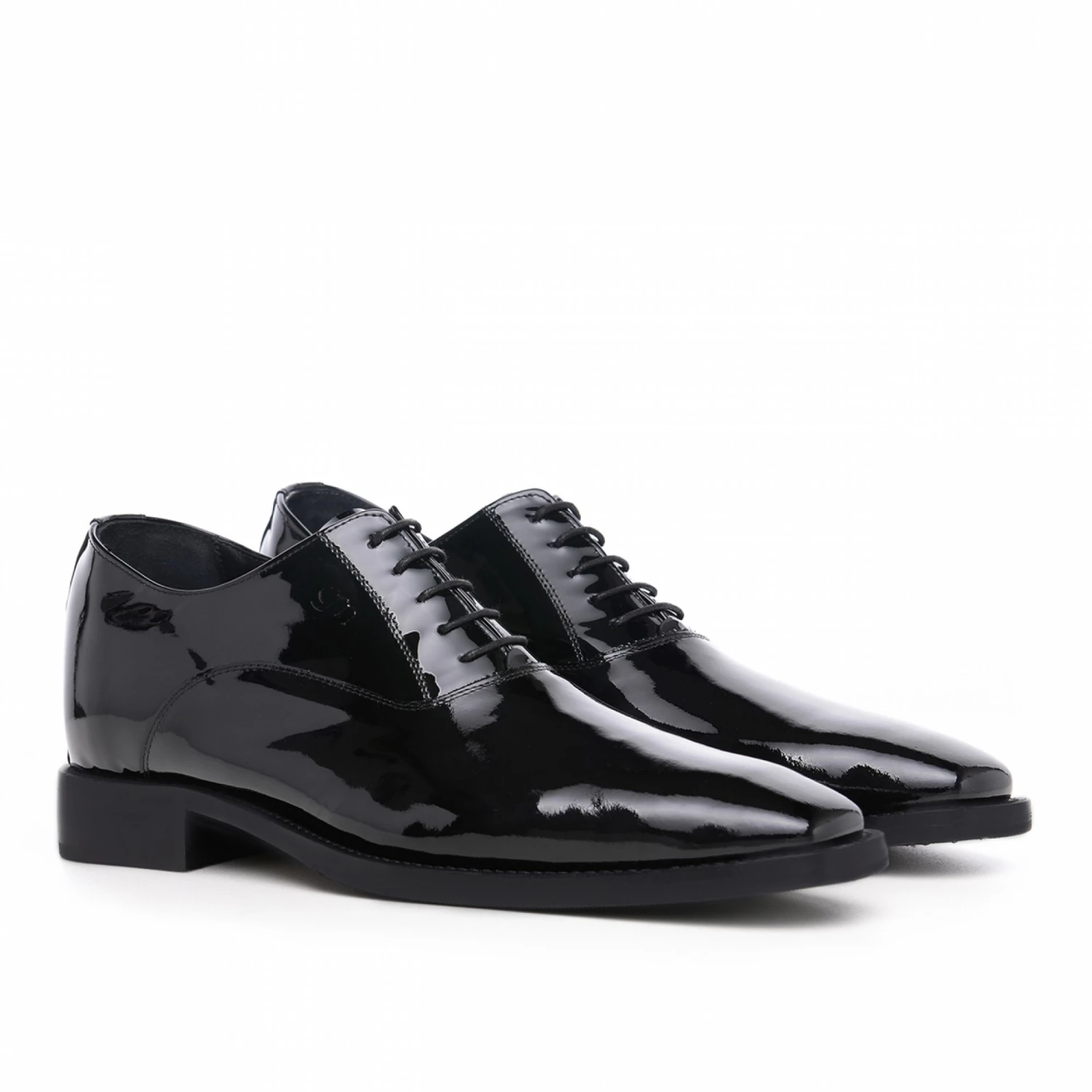 Elegant elevator dress shoe with upper in black patent leather and stiched leather sole with anti slip rubber. Ideal for the groom or any formal occasion.