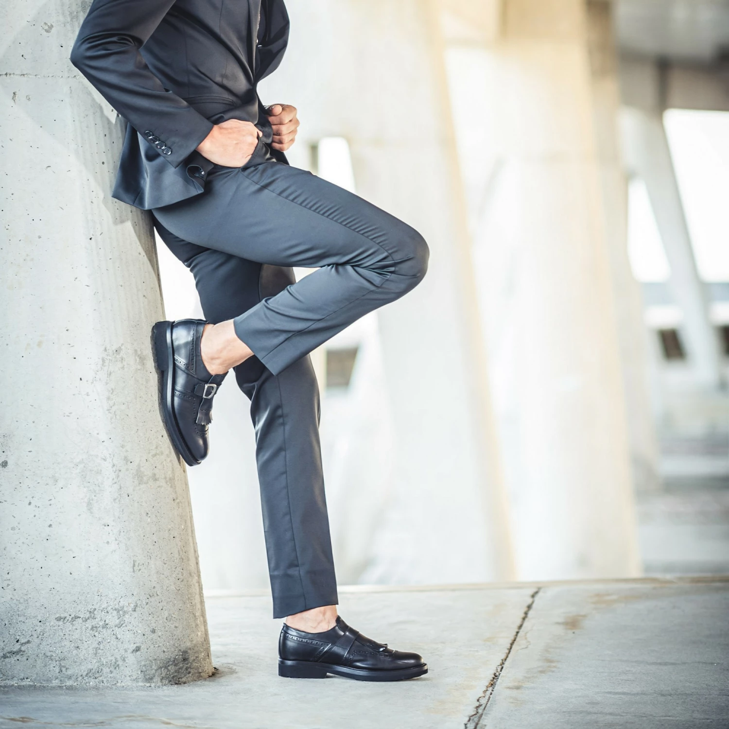 Versatile and modern elevator single monk strap shoes with upper in black full-grain leather, embellished with elegant tone-on-tone fringes. The natural rubber sole is stitched at sight.
