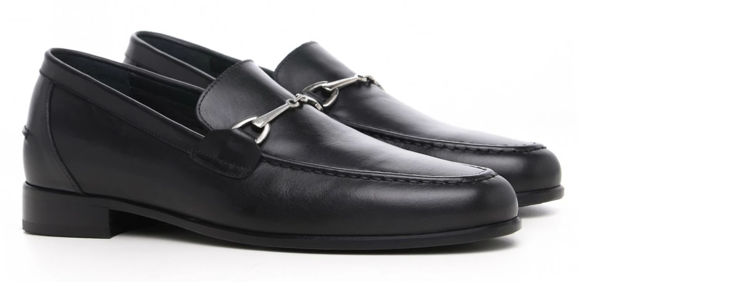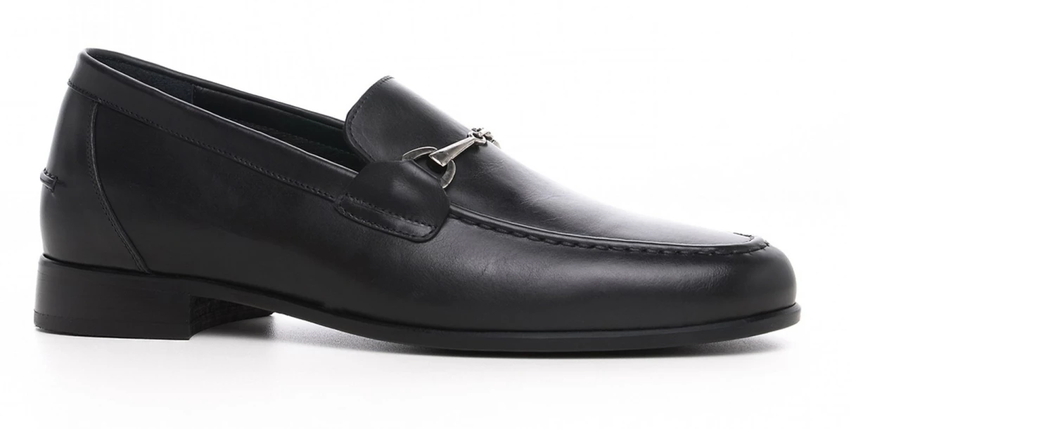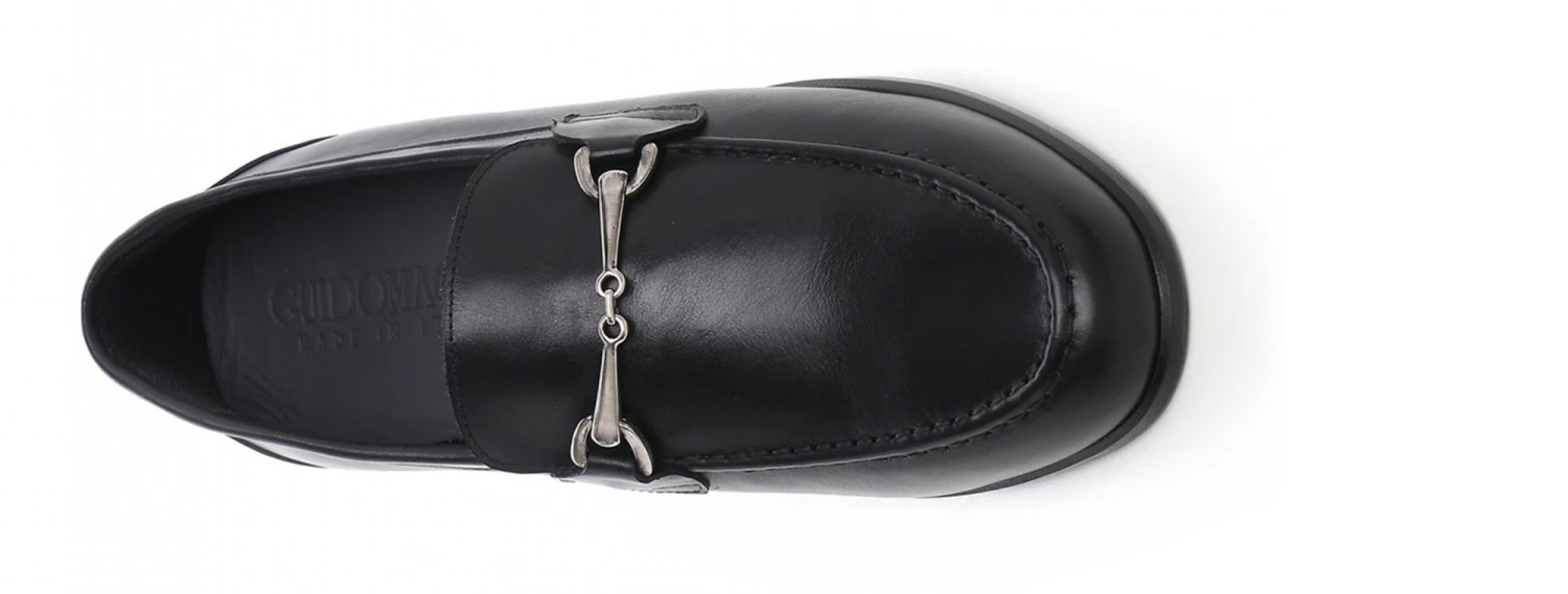 Elegant handcrafted elevator loafer with upper in black full grain leather, embellished with hand stitching details on the counter heel and the particular silver clamp. The sole is made of genuine leather, joined and sewn at sight.