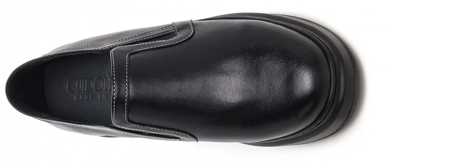 Elevator slip-ons in black full-grain leather and white handmade stitches for a harmonious black and white effect. The natural rubber sole guarantees the maximum versatility and comfort.