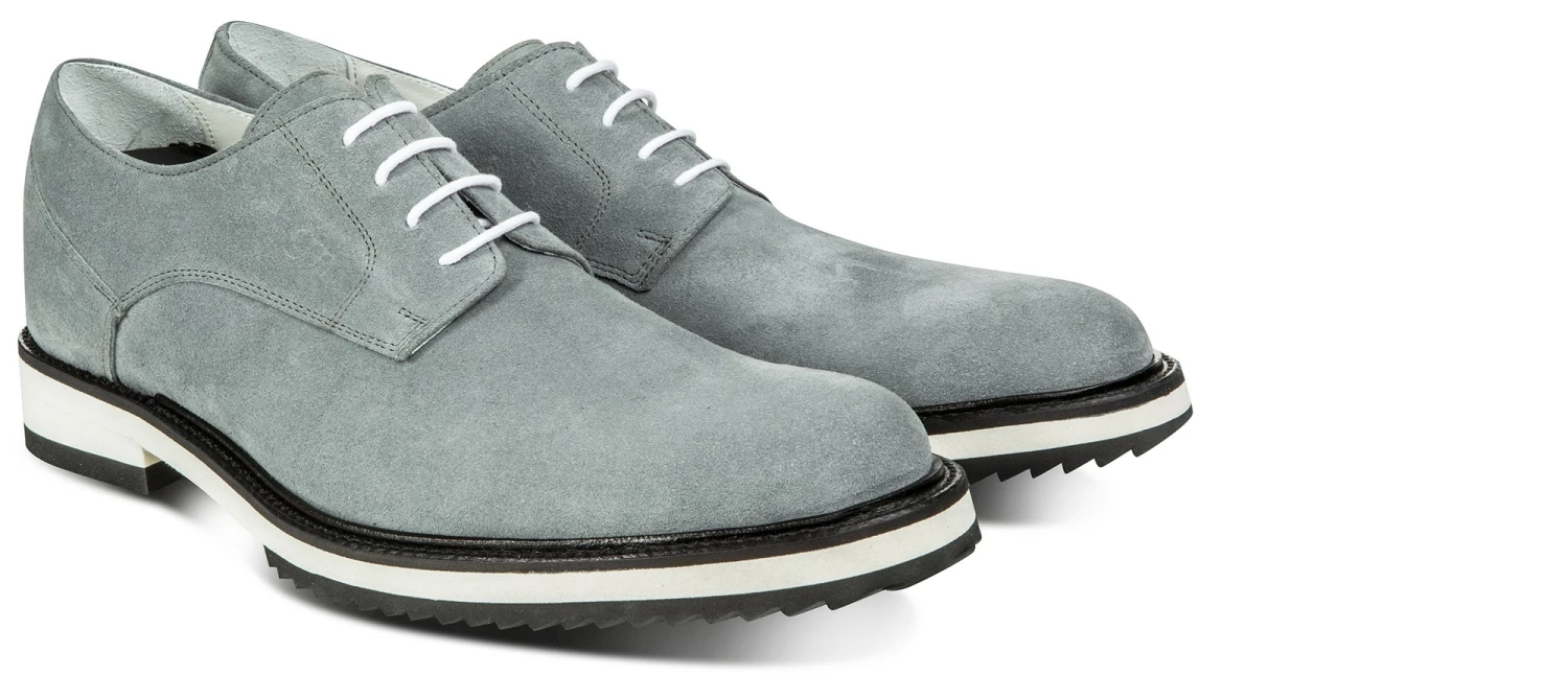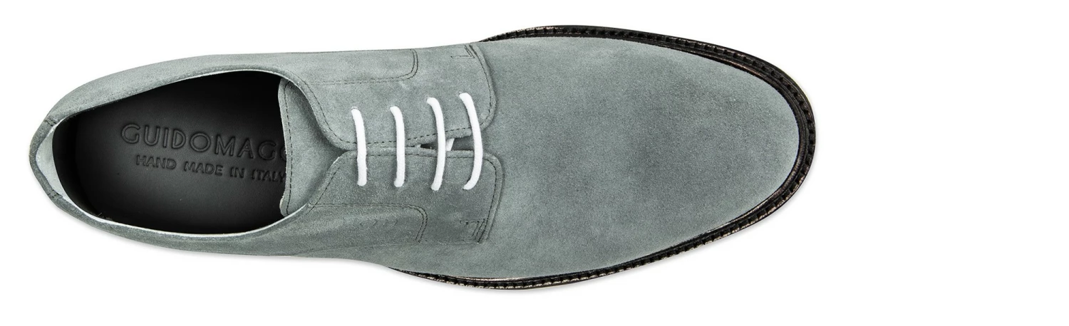 Keyword: elegance. From the spring-summer collection, the new elevator derby signed by GuidoMaggi has magnetic lines and class to sell. The handmade and custom-made elevator shoe has an upper made entirely of grey suede. The sole in micro, black and white, and the particular toothed tread complete the innovative design. Perfect for any seasonal outfit, it is capable of giving up to 3.15 inches of extra height. Handmade in Italy.