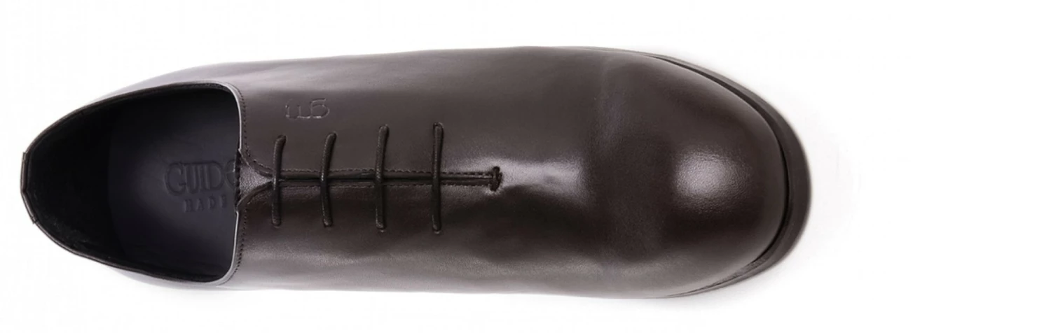 “Wholecut” refined elevator shoe in dark brown full grain calfskin and stiched leather sole with anti slip rubber.. A shoe obtained thanks to a meticulous handcrafting technique in which the upper is created using a single piece of leather without stitching.