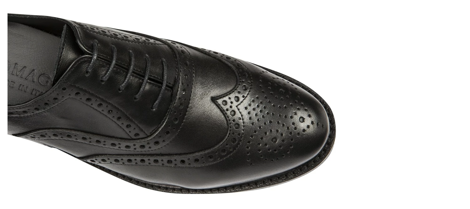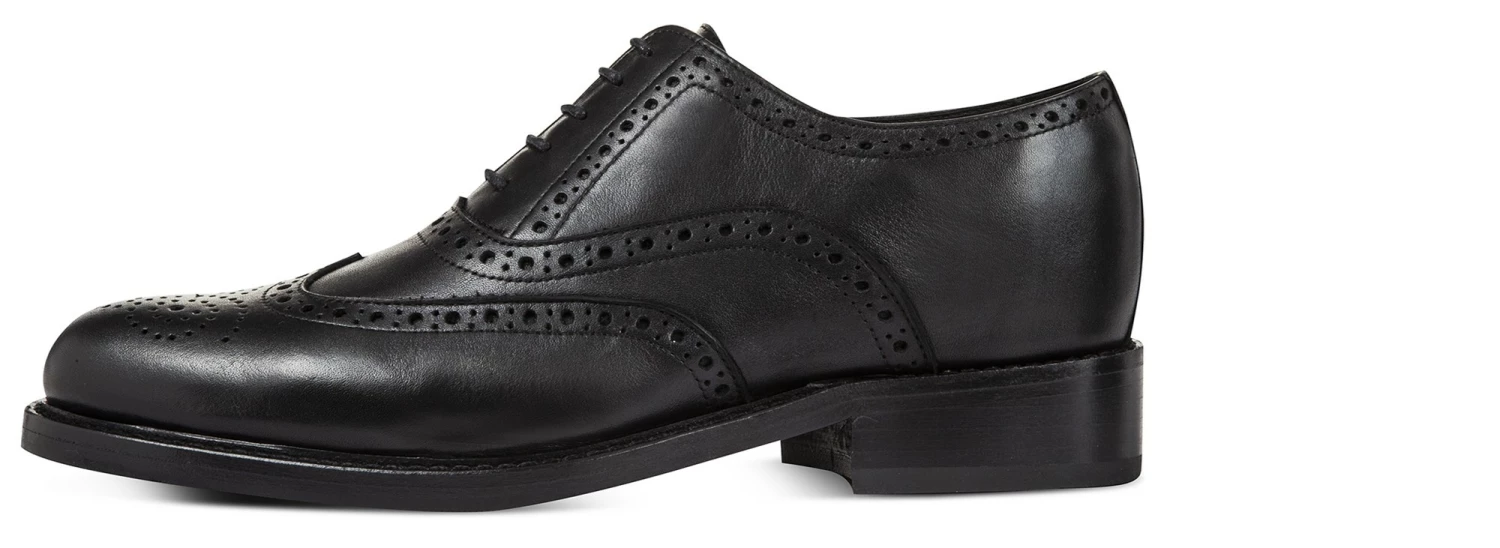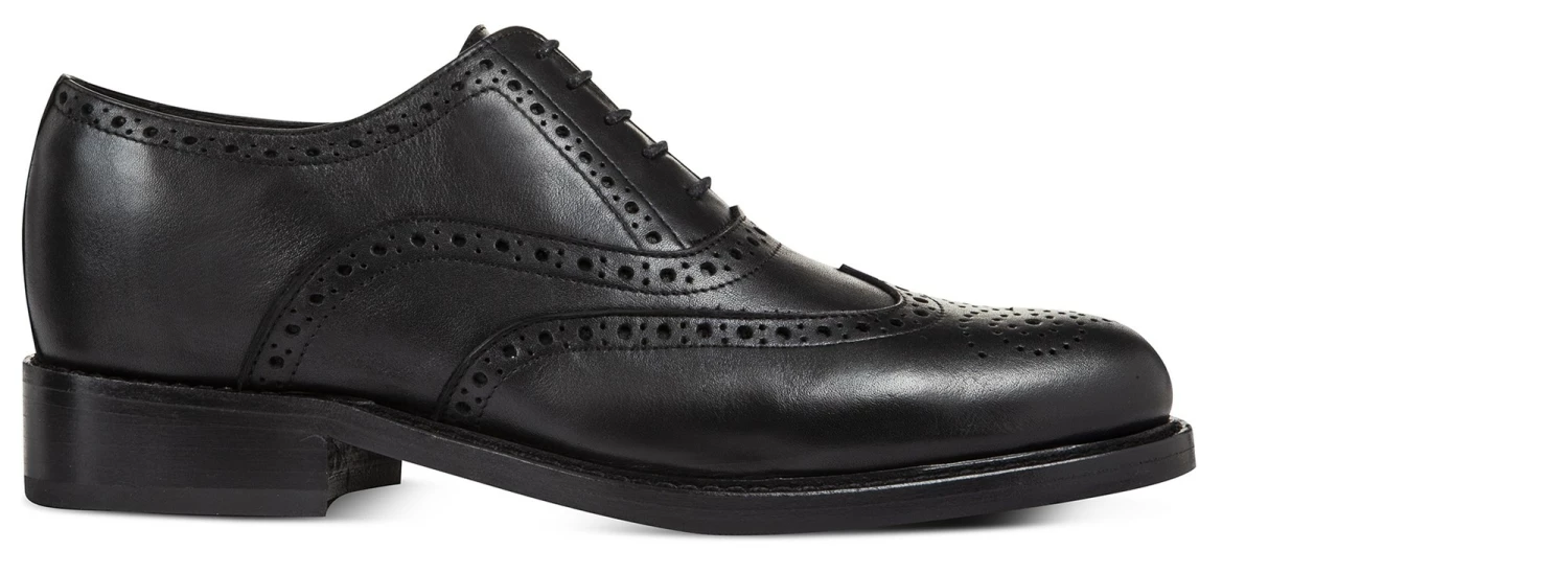 Height increasing oxford shoes with upper in black calf leather featuring handmade full brogue decoration and stiched leather sole with anti slip rubber.