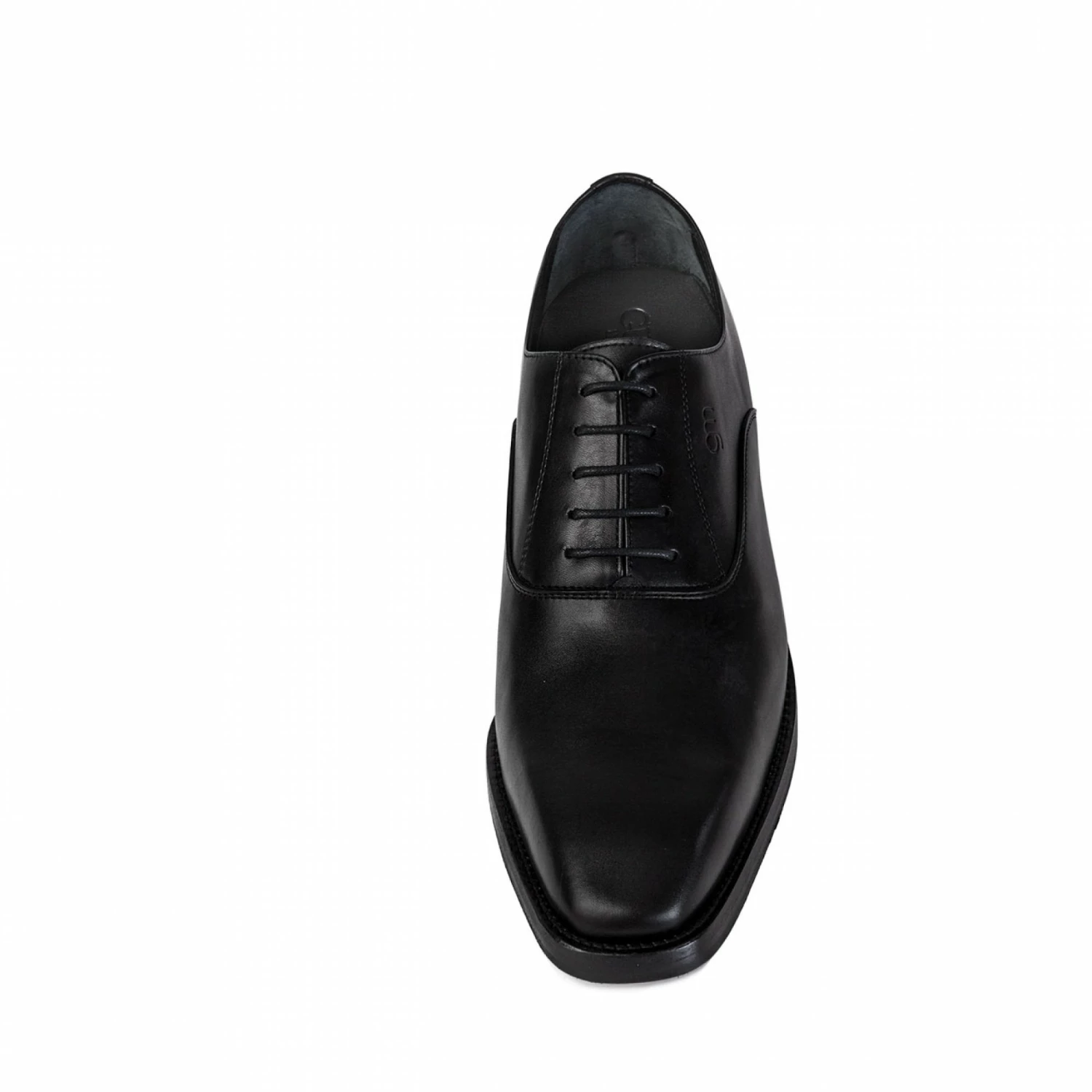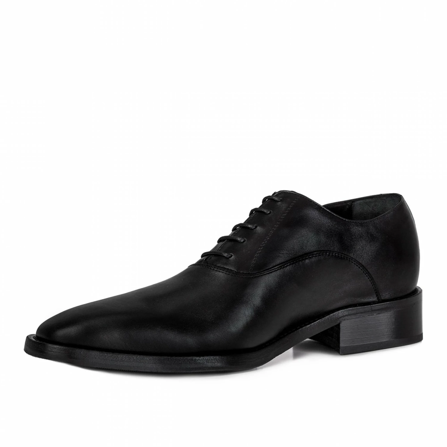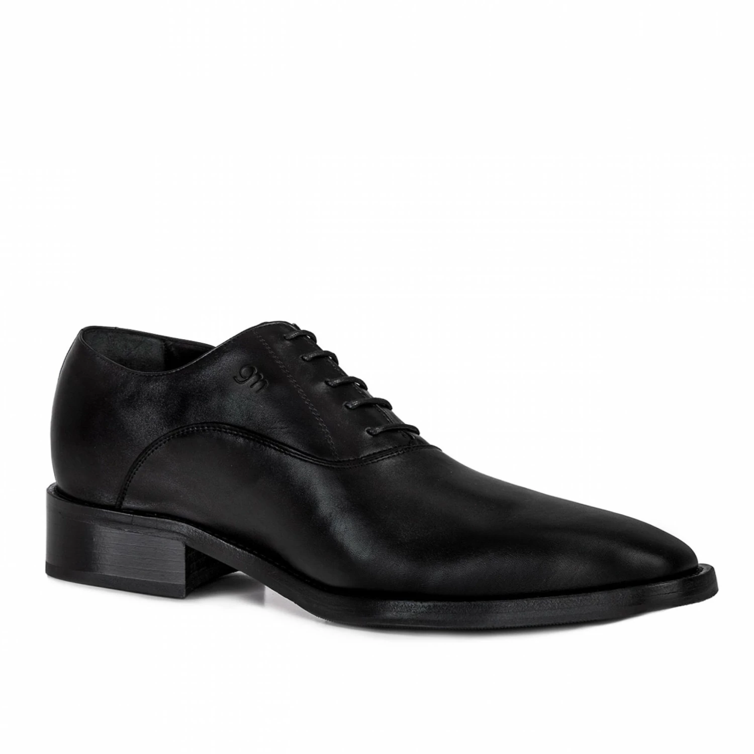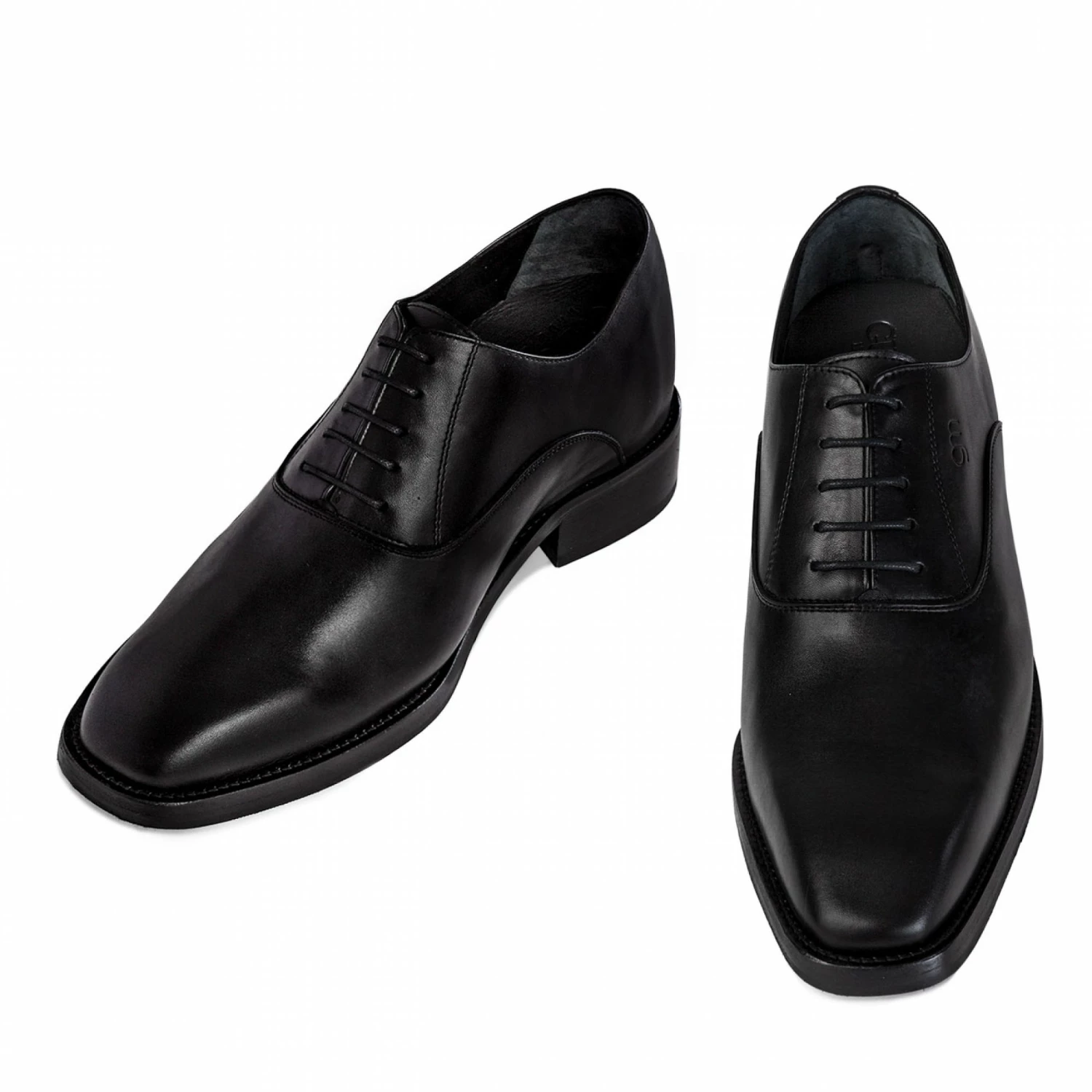 Exclusive height increasing oxford shoes with upper in black full grain vegetable-tanned leather and real leather sole.