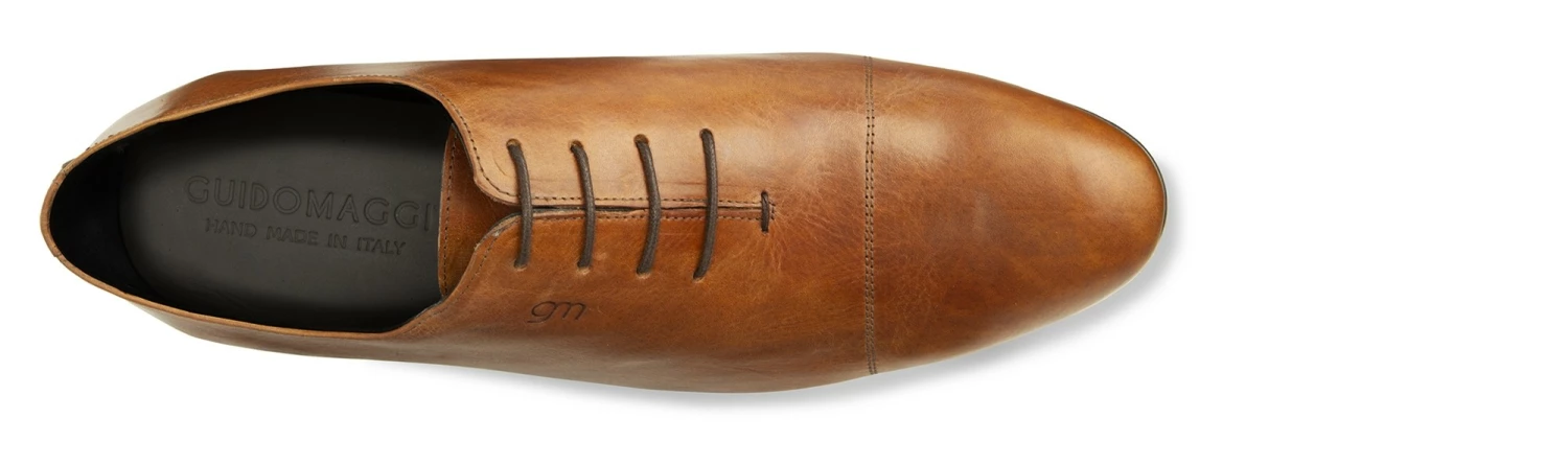 The new elevator model by GuidoMaggi celebrates the most refined and exclusive minimalism. This elevator shoe is made from a single piece of leather, hence its name: wholecut. The upper, handpainted, is in non-uniform brown tones, with stitching on the tip. Up to 2.56″ of extra height in total comfort and discretion for all your special occasions. 100% made in Italy.