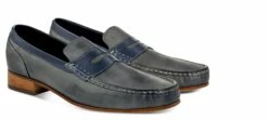 Two-tone elevator penny loafer featuring upper made of gray calfskin buffered by hand and blue full-grain leather. The natural leather sole with anti-slip rubber is sewn at sight.