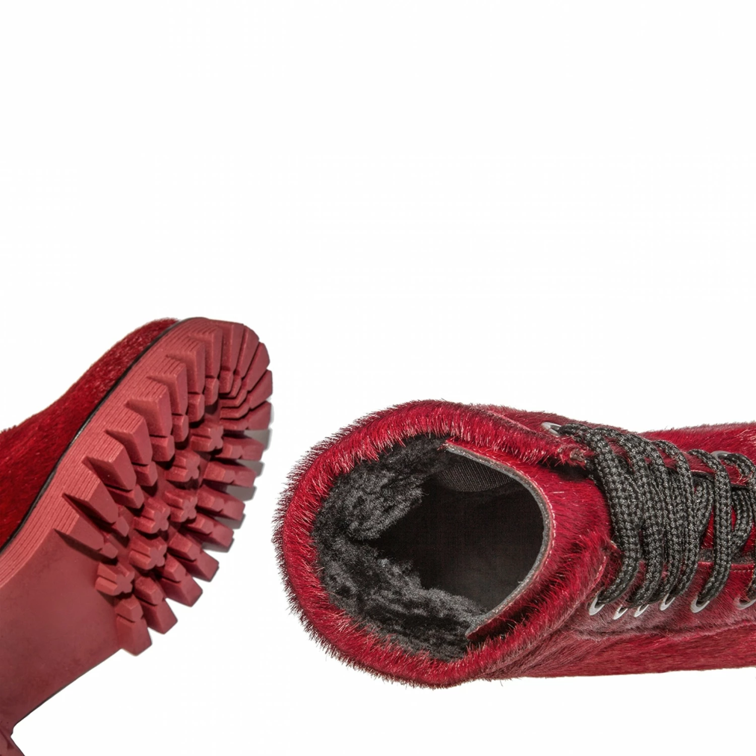 Contemporary chic: elevator lace up boots with upper made of red pony skin leather and striped sole in tone on tone super-light natural rubber. The inner lining is made of warm sheepskin. Red Fox is able to increase height from 2.4 (6 cm) up to 4 inches (10 cm) in absolute comfort.