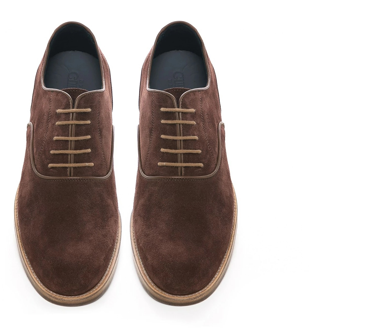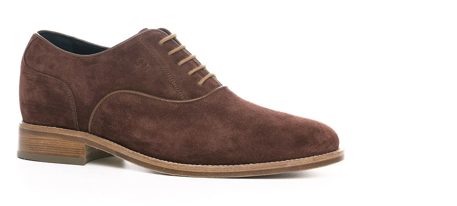 Elegant elevator Oxford handmade in Italy with upper in brown suede and Goodyear welted leather sole. An exclusive artisanal shoe featuring an invisible inner elevator system to choose from 2.4 (6 cm) up to 3.1 (8 cm) depending on needs.