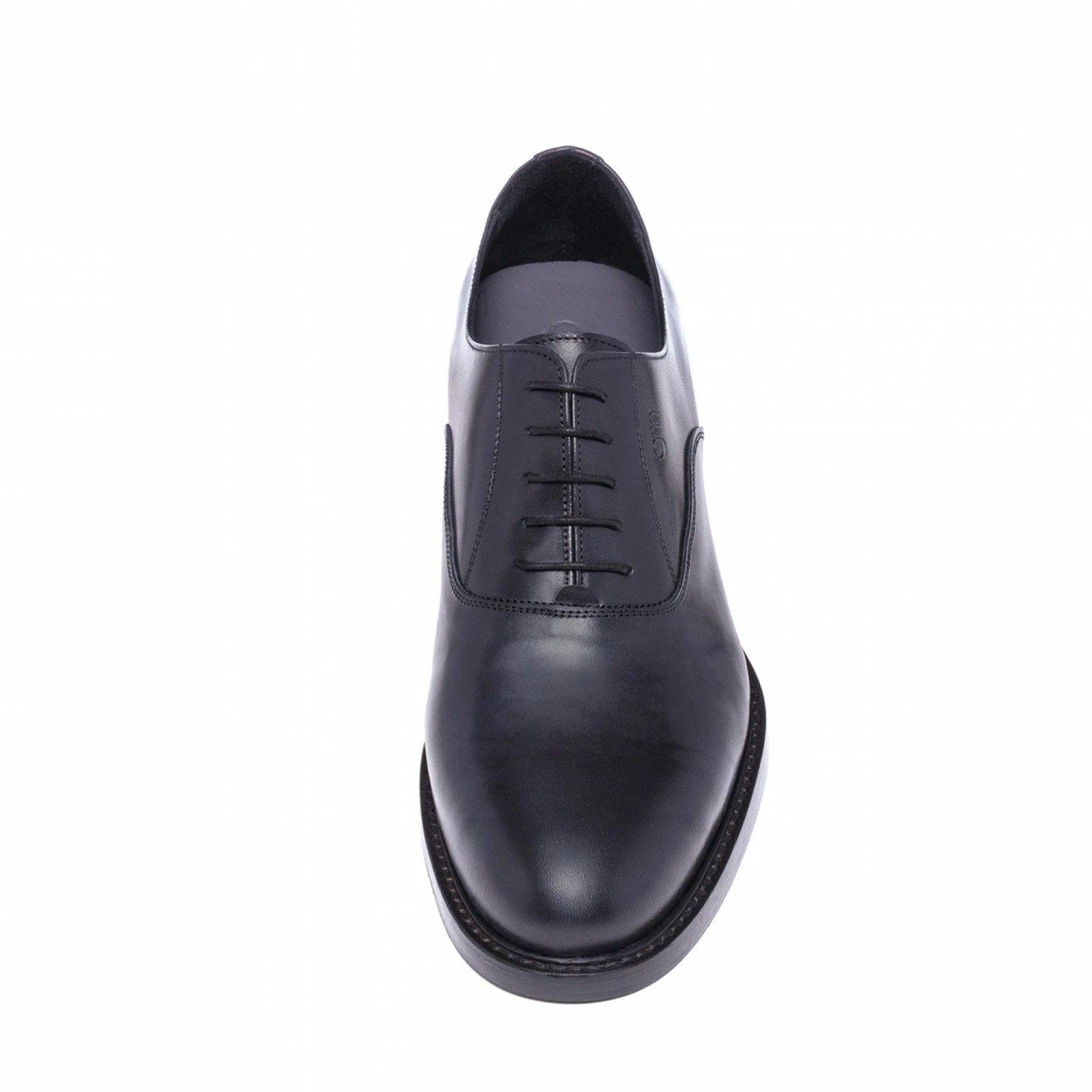 Exclusive elevator shoe with fine upper in Cordovan leather featuring a naturally shiny “black lux” colour and stiched leather sole with anti slip rubber.