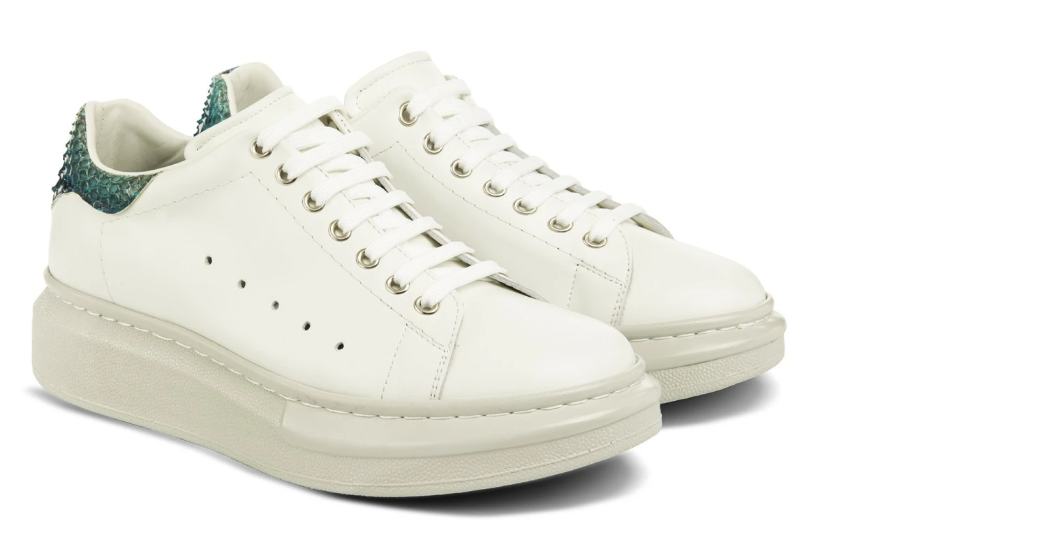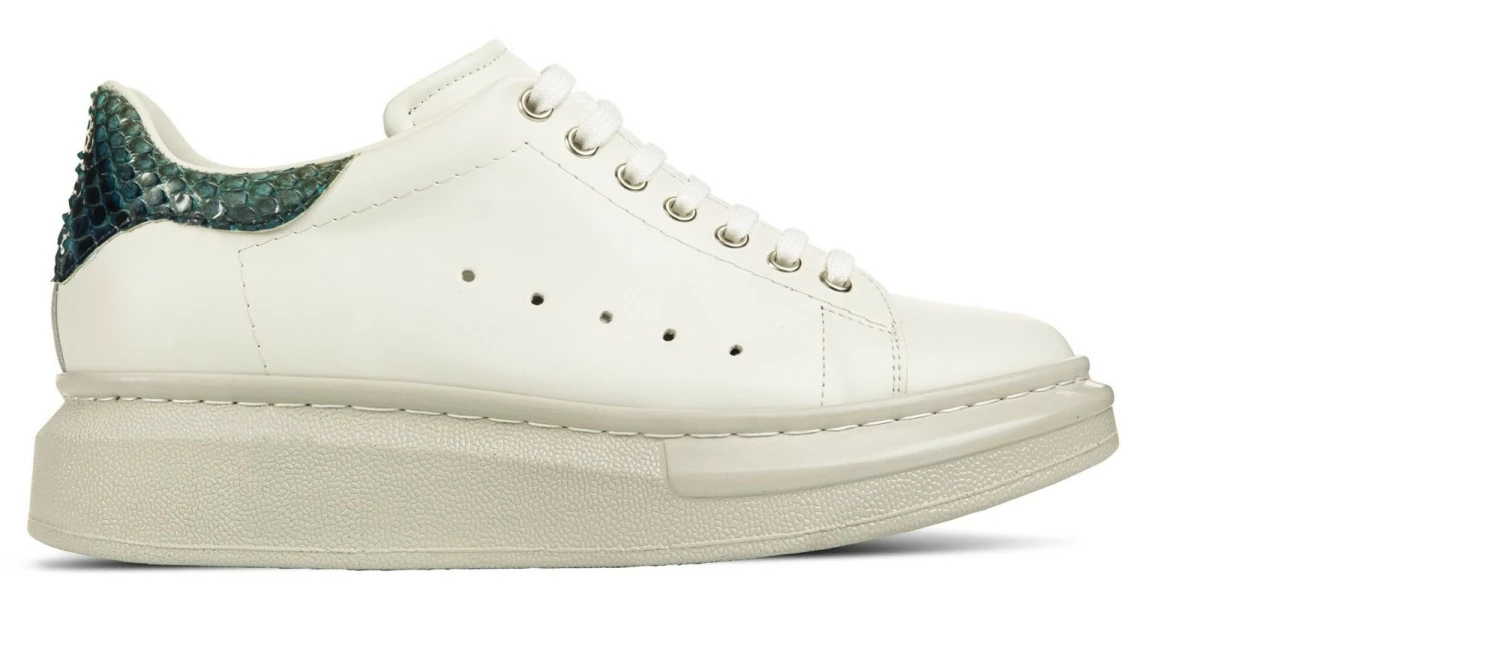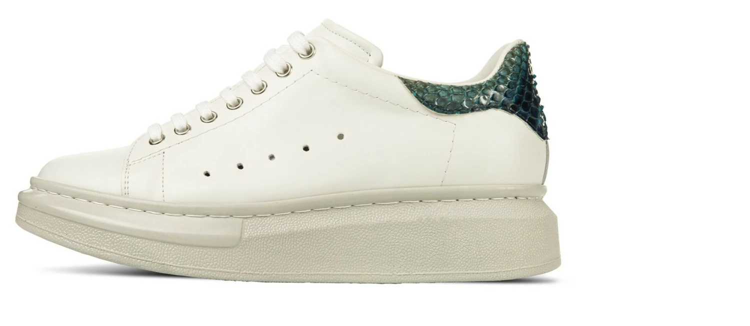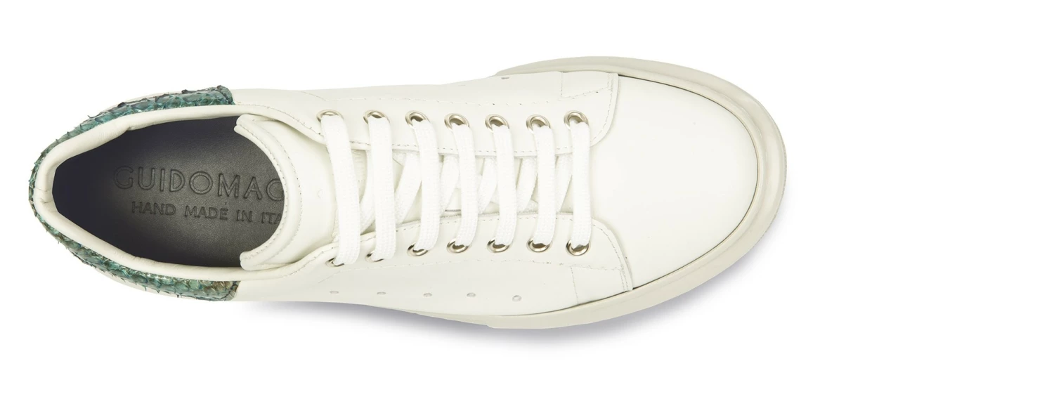Luxury elevator sneaker with upper made of white full-grain leather, heel tab in fine green python leather and ultra-light natural rubber sole.